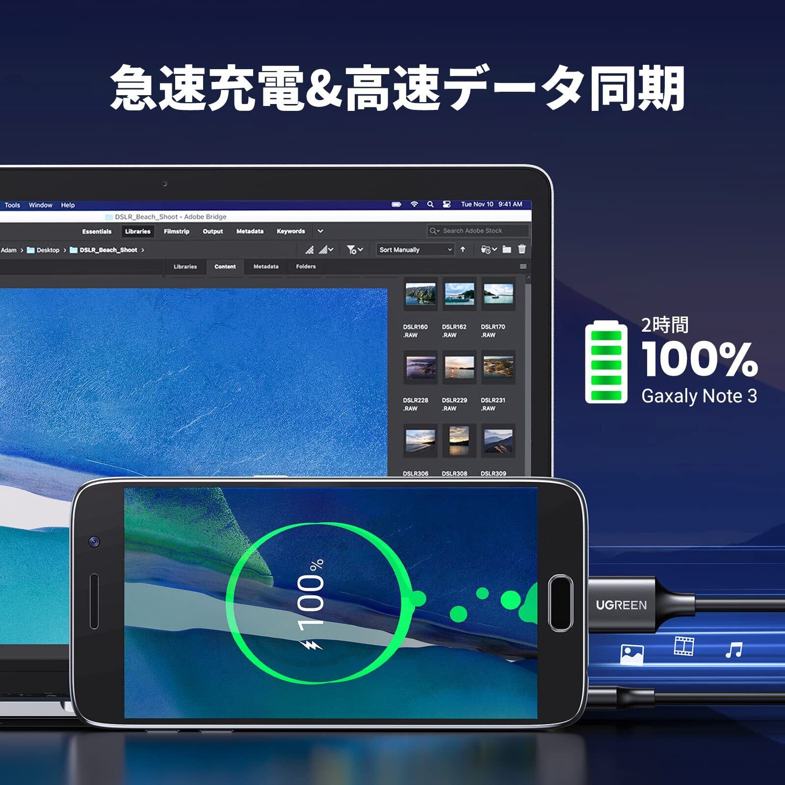 最大5Gbpsの高速伝送対応:USB2.0の最大転送速度480Mbpsの10倍以上最大5Gbpsの高速データ転送を実現し、時代の進みにつれて高速データ転送を求めている方々に最適なUSB3.0 MicroB USBケーブルです。更に、バスパワー能力も5V/2Aに対応するようになり、大型のUSB機器もACアダプタなしで接続できます。