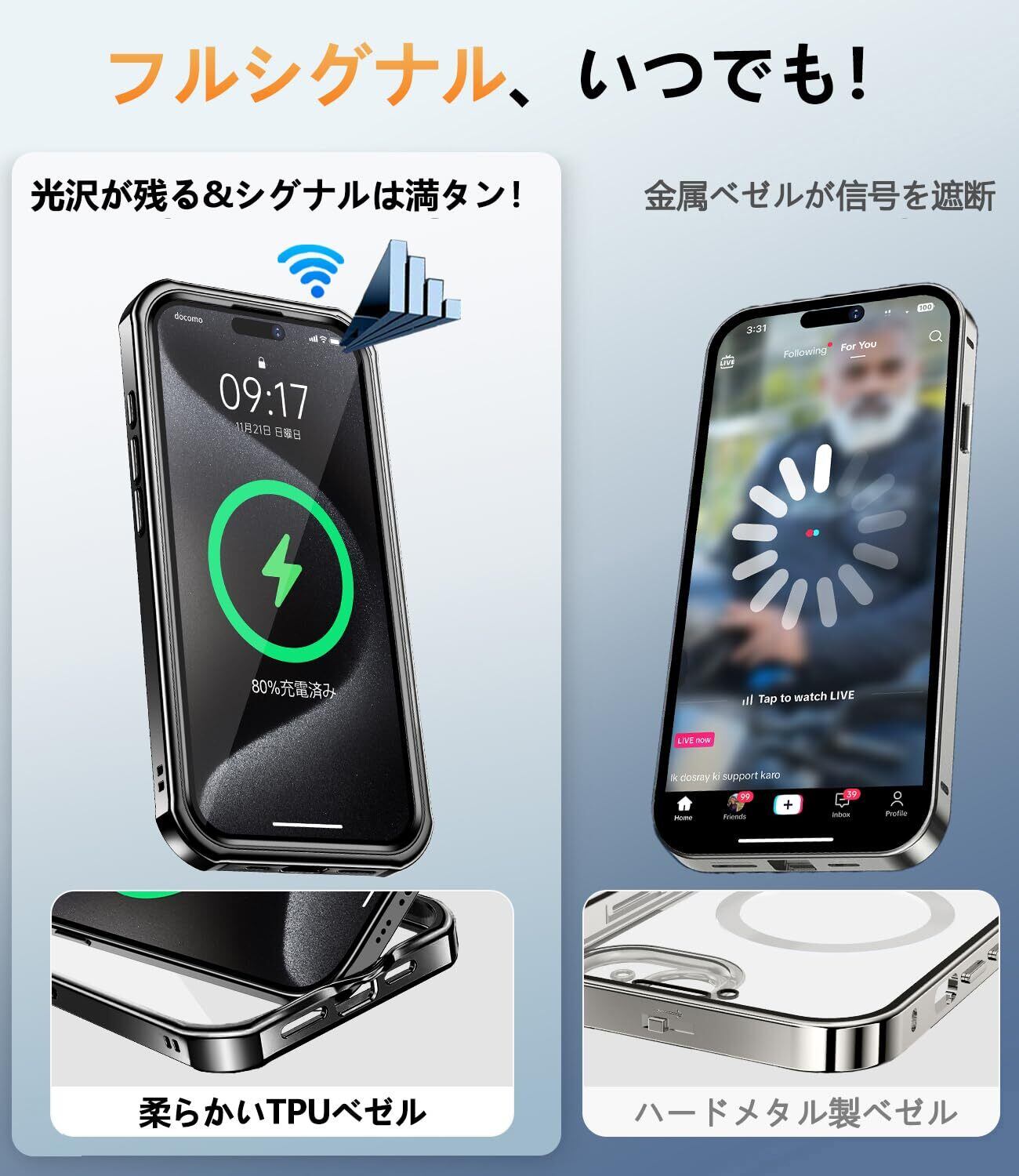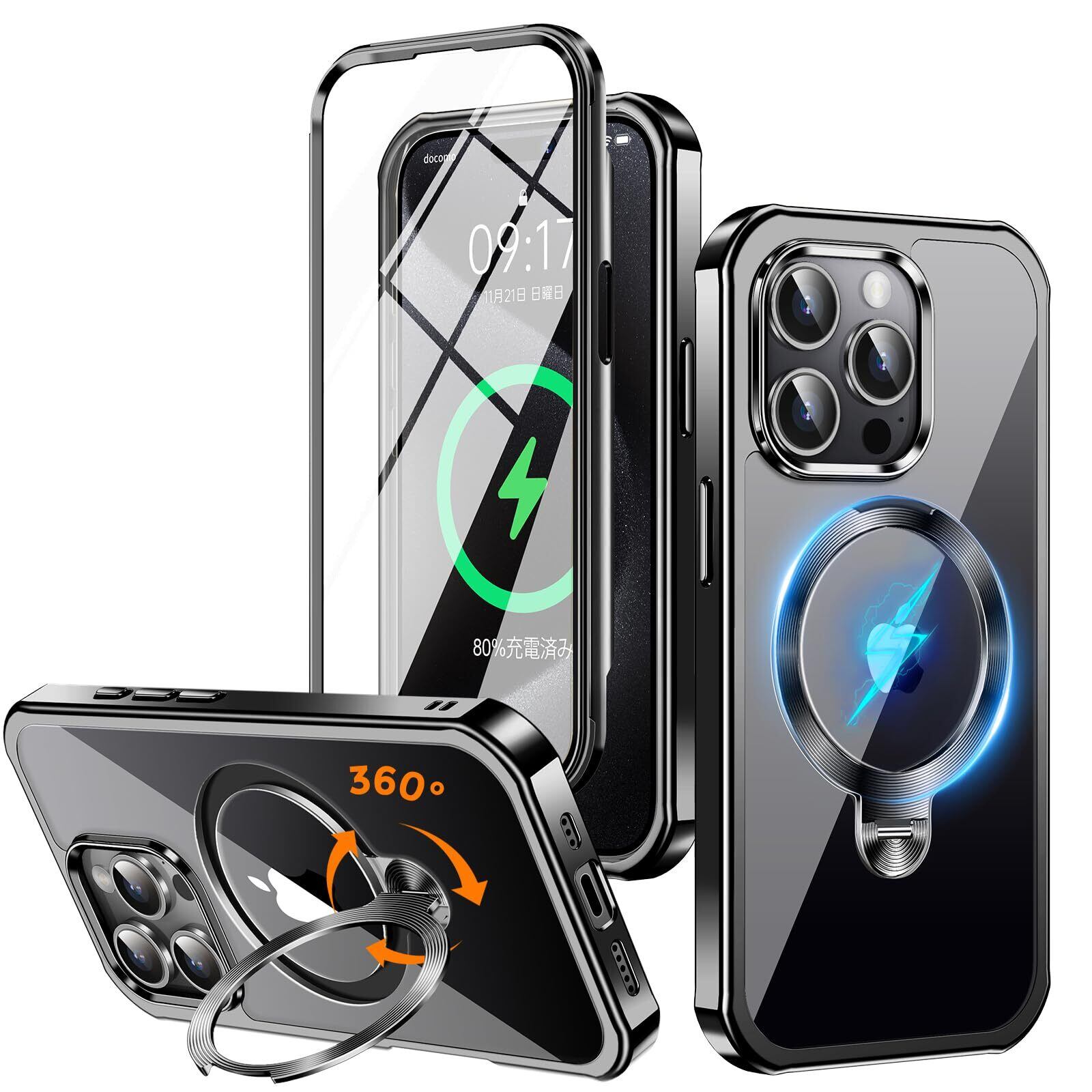 【360°回転CD スタンド・両面完全保護・MagSafe対応】NIANGUO iPhone 15 Pro Max 用 ケース [横縦両立・隠し定点回転スタンド・超絶安定性] [本体の色・ソフトメッキバンパー&完全信号!] ストラップホール付き 米軍MIL規格取得・耐衝撃・極透明9H強化ガラス ふぉん15 pro maxケース スマホケース15プロマックスック人気6.7インチ(ブラック)