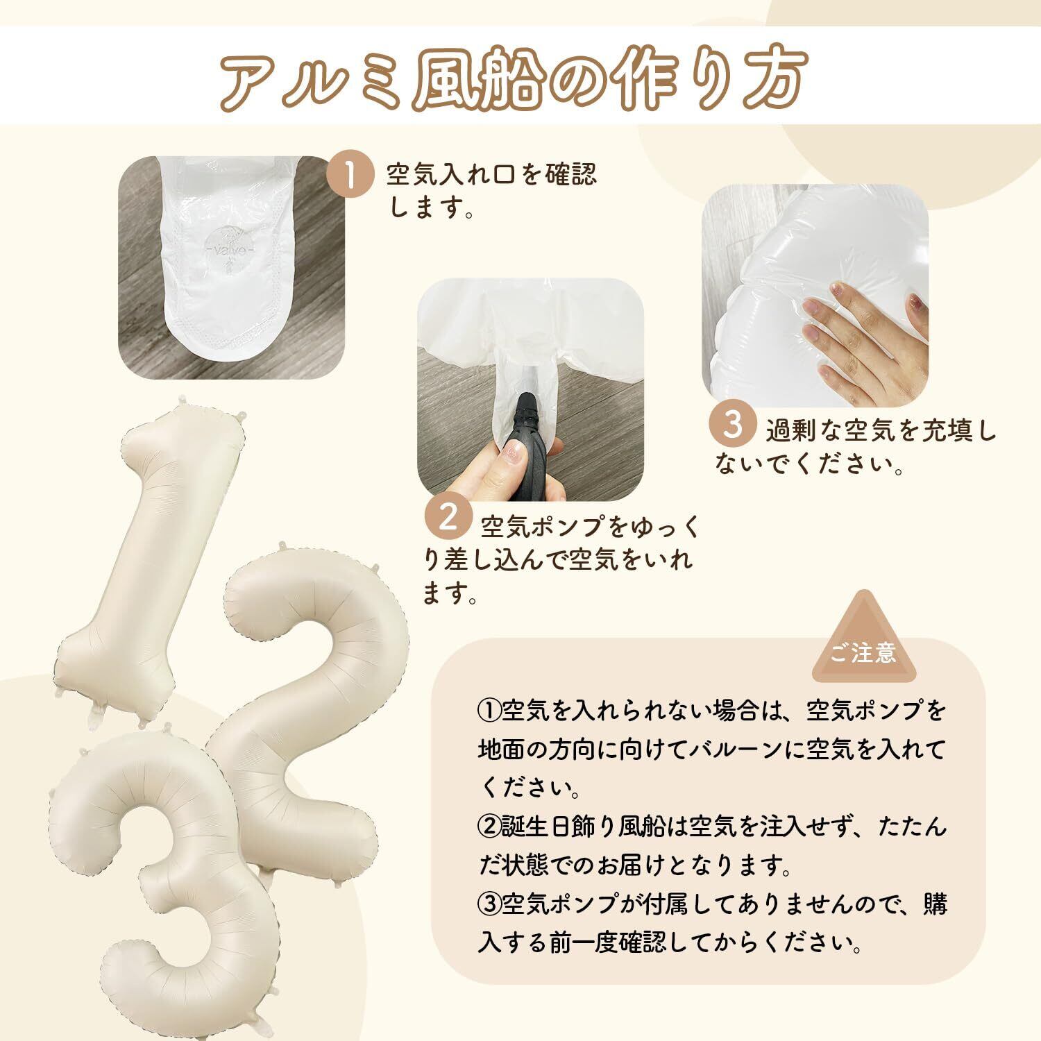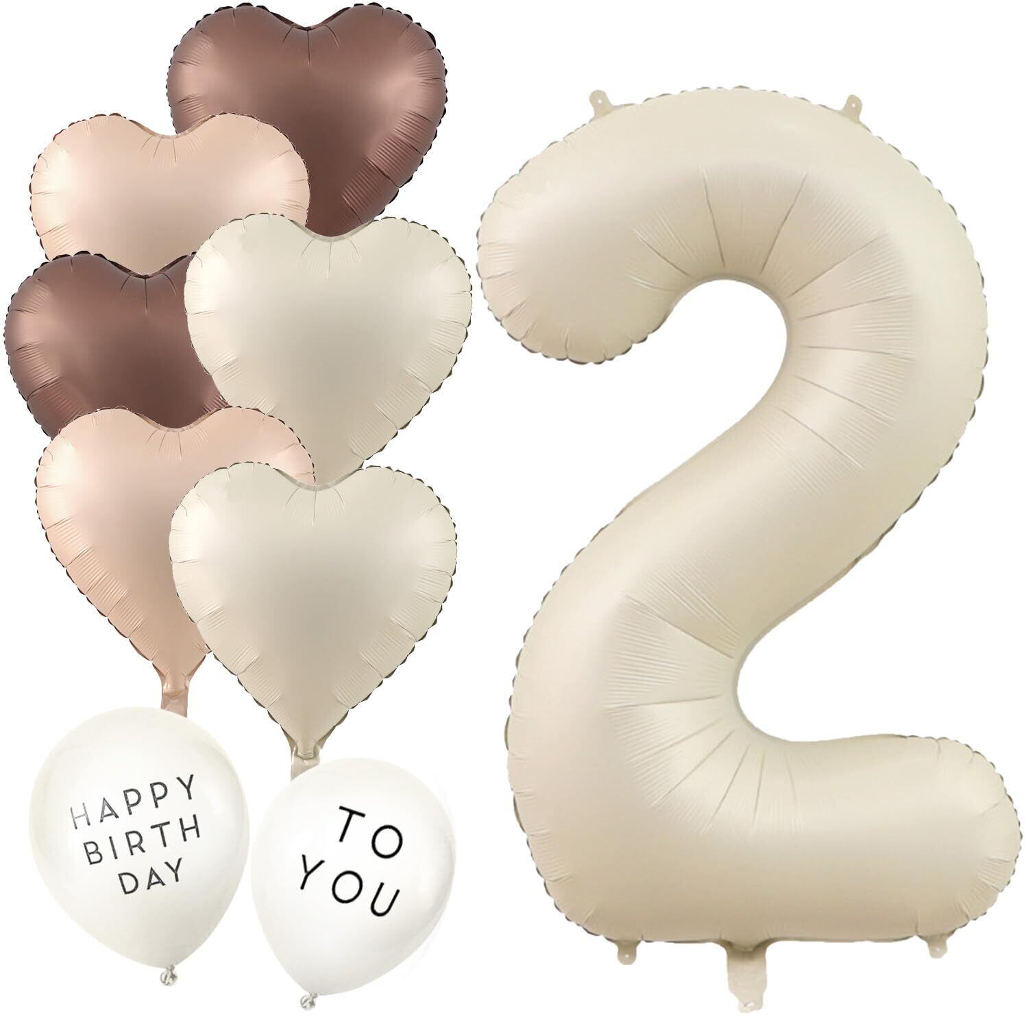 『パッケージ内容』①数字“2”アルミ風船×1 ②ハートアルミ風船×6(くすみホワイト色,肌色,チョコレート色各2個) ③happybirthday文字バルーン×2個(予備各1個)