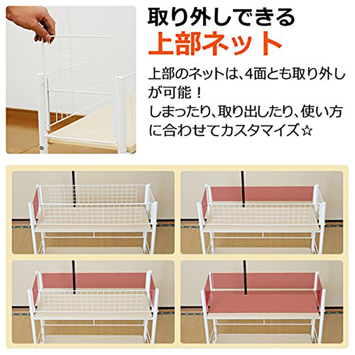 ●上部ネットは4面とも取り外しが可能。さらに棚板もカンタンに取外しできるので、シーズンオフの家電収納にも。