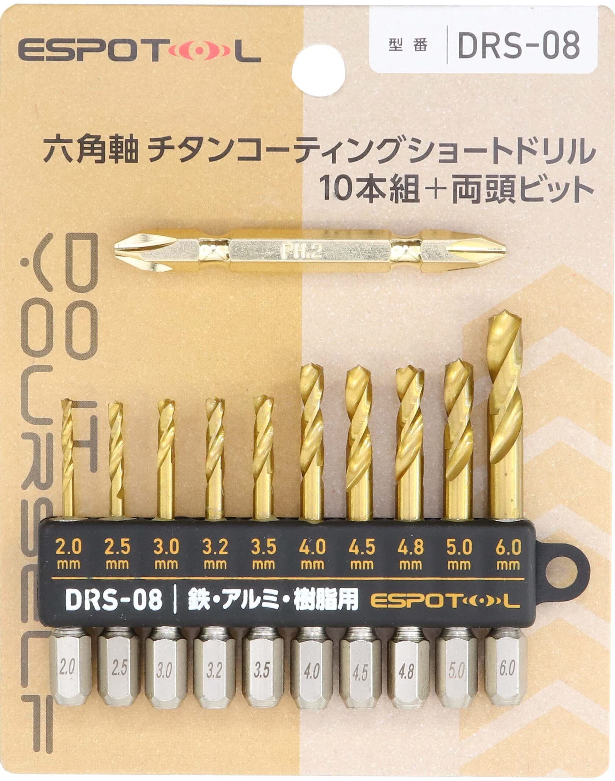 ESPOTOL(エスポツール) 六角軸 チタンコーティング ショートドリル 10本組 +両頭ビット付