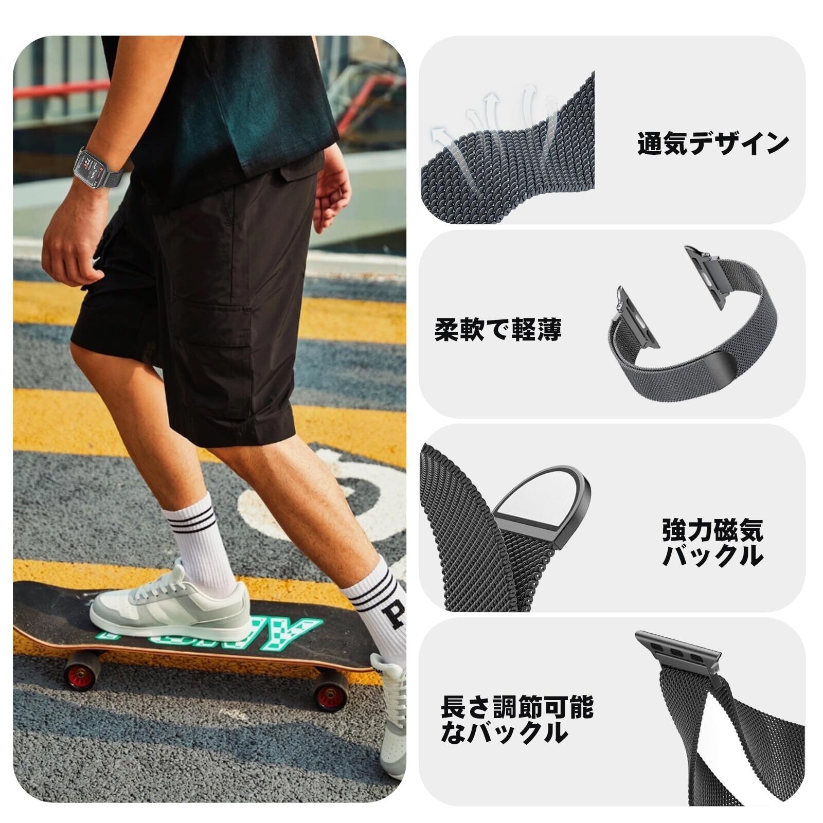 【ユニークなデザイン】:iWatch バンドは、ユニークな磁気ロックと表面研磨を備えて、メッシュデザインにより、アップルウォッチ バンドが肌に接触しやすくなり、通気性が高く、快適に着用できます。磁気ロックデザインにより、工具を使わずにバンドを簡単に取り付けたり取り外したりできます。初心者でも簡単に着用できます。(ご注意:本製品はスプレーオイルで表帯の表面を磨いているため、使用時には金属製の物体と摩擦しないでください。そうすることで、製品が色落ちする可能性があります。)