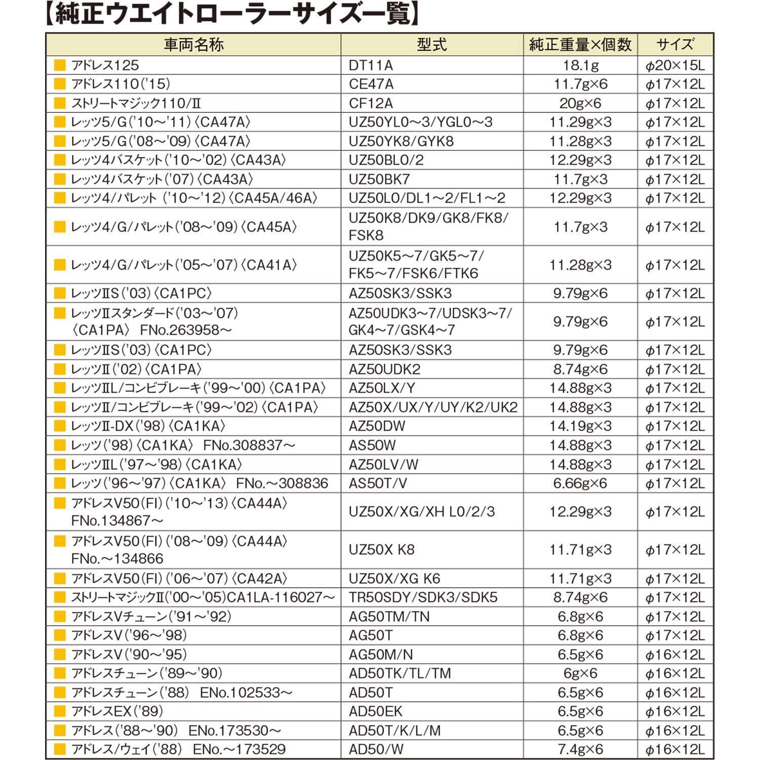 ●プーリーへの組付方向指定がない一体成型タイプのウエイトローラー。インナーメタル部の片面に製品サイズ(外径×幅)を、もう片面に製品グラム数をレーザー刻印。高いコストパフォーマンスで純正リプレイス用としてもおすすめ。