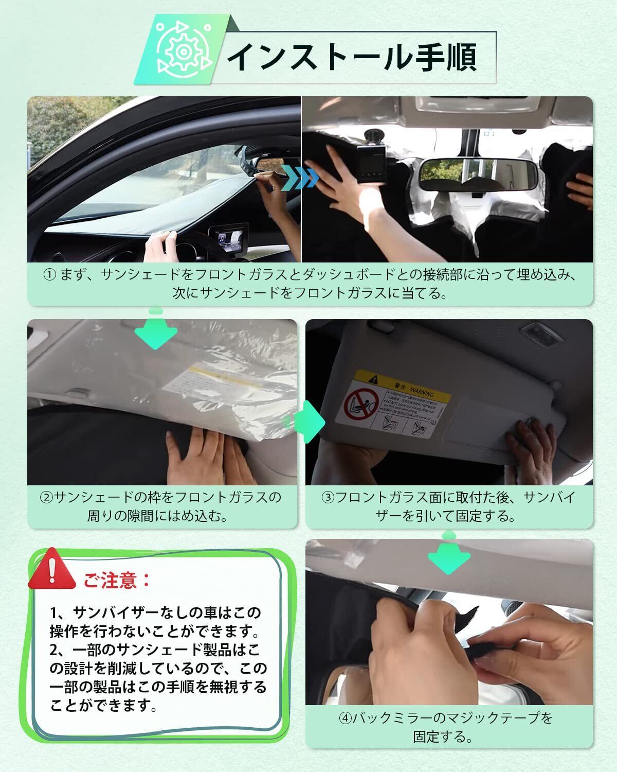 【取付簡単】スペーシアカスタムmk54s サンシェードを広げて、サンシェードの靭性を利用して車のフロントガラスに取り付け、サンバイザーで挟んで固定すればいいです。あまり時間をかけなくても、初心者でも取付ができます。また、サンシェードは記憶機能のある筋金で作られていますので、収納も簡単で、車内の使用空間を占用することもなく、再使用しても変形しません
