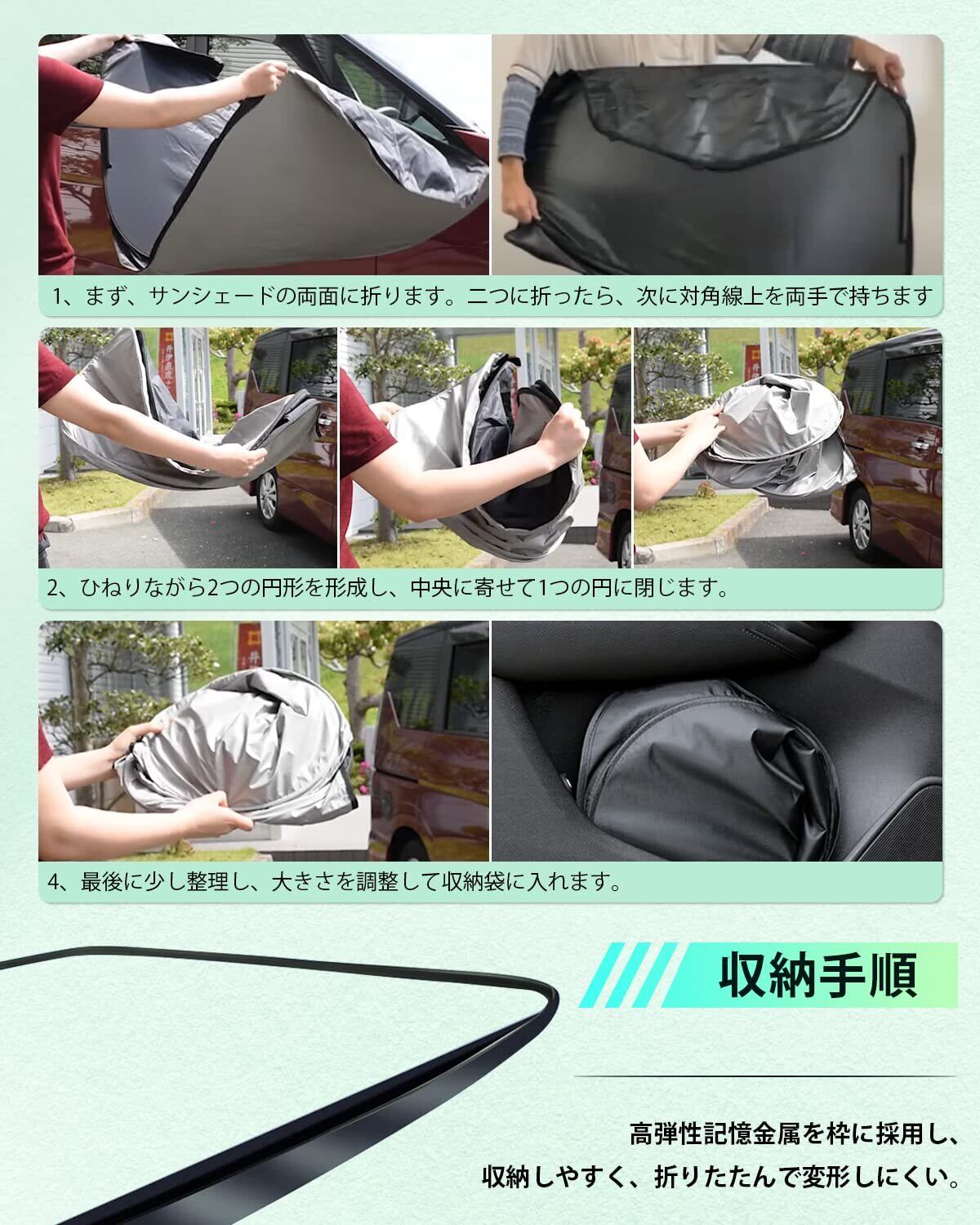 【材質・構造】高密度アルミメッキ反射層・ポリウレタン耐熱断熱層・UVチタン銀コーティング断熱層・ナノ断熱遮光素材。4層構造を採用し、4つの異なる材質が共同でスペーシアカスタム サンシェードの反射層と断熱層を構築し、夏の日差しの猛烈な照射を遮断させ、車内の温度を減らすことができます。また、99%以上の紫外線の侵入を効果的にカットし、健康を守ることができます。高品質・高密度のナイロン布を使用して作られ、軽量で耐久性に優れています。