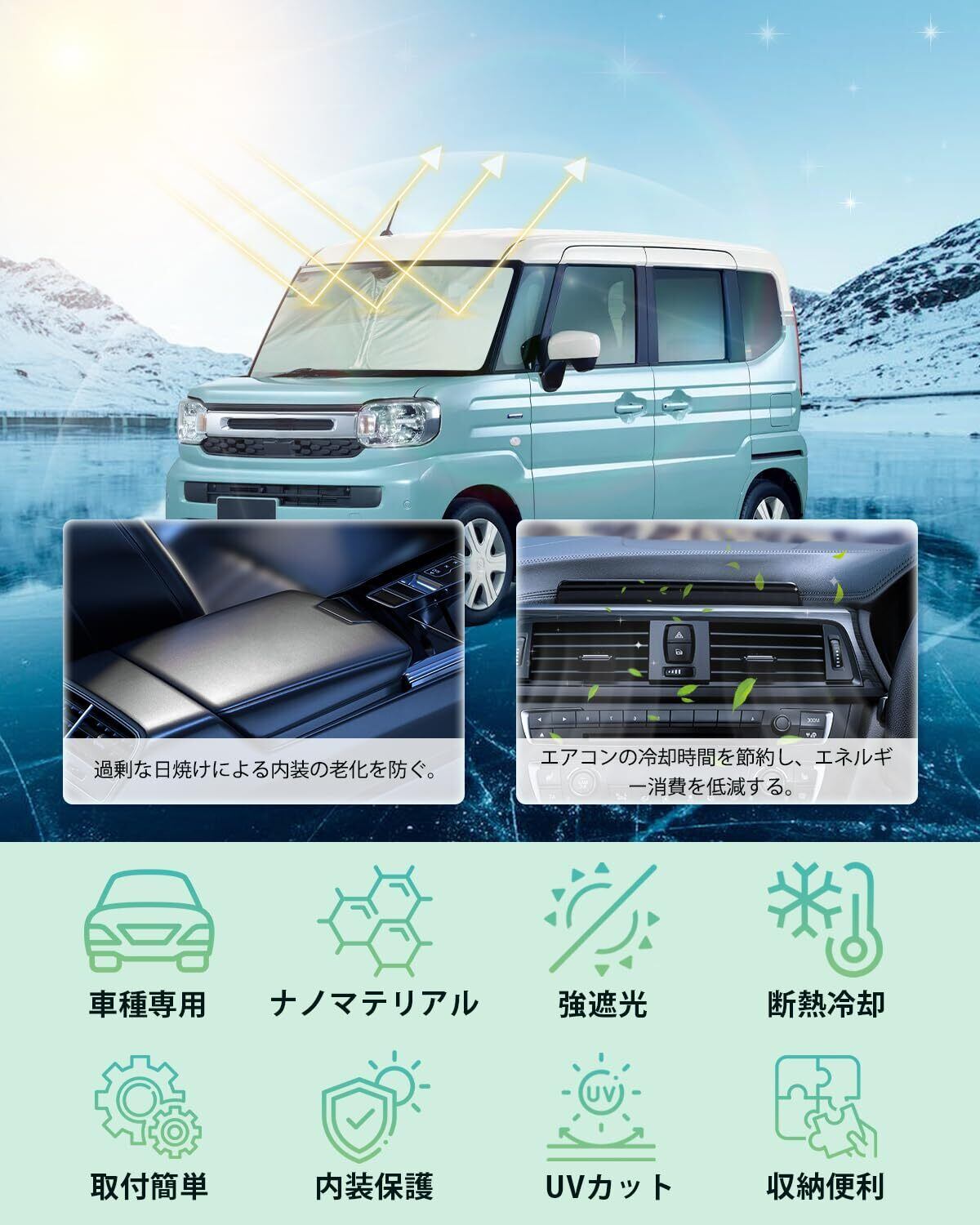 【多機能】スズキ スペーシアmk94s 専用サンシェードは高品質のナイロン布をチタン銀コーティング技術で配合し、高分子構造保護により、夏の日差しと紫外線の侵入を遮断し、耐え難い高温を遮断し、日焼けによる車内の高温を減らすことができます。また、冬は冷気の侵入を防ぎ、車内の温度を保ち、保温効果も優れています。夏であろうと、冬であろうと、車内でゆっくり休憩することができます。また、車内の設備の老朽化と破損を防止し、愛車を保護します。