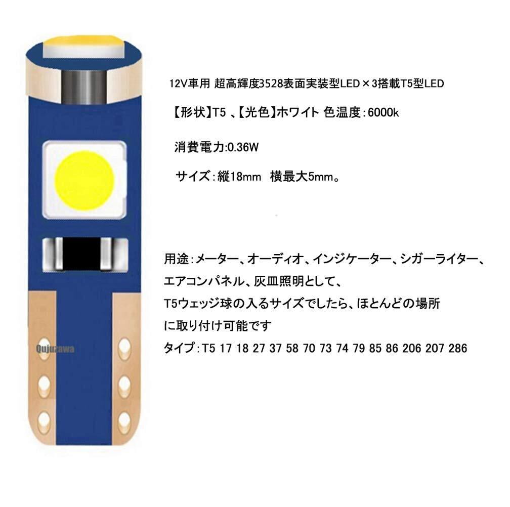 T5 LED メーター球 パネル球 エアコン球 ウェッジ球 ホワイト 白 ダッシュボード メーター インパネ エアコンパネル ルーム 汎用 LEDバルブ LED電球 マイクロ ランプ ライト 12V 車用 バイク用 高輝度 拡散 3528SMD 3連 10個セット