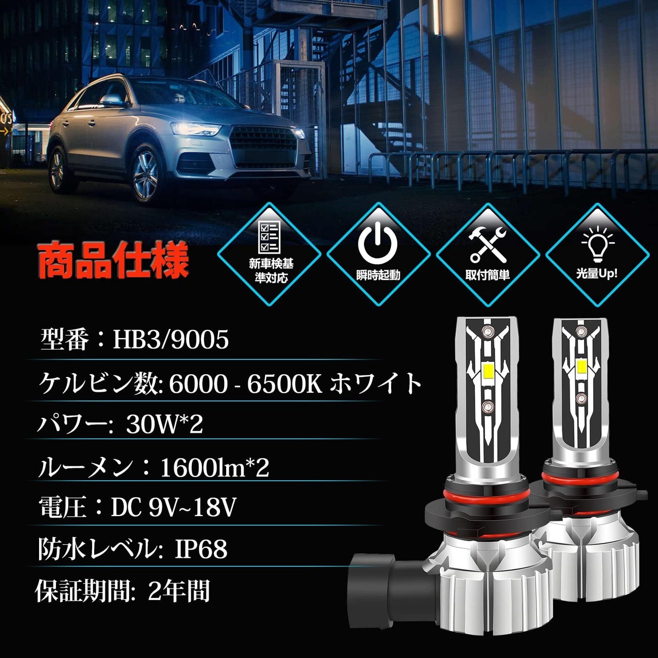【最先端CSPLED チップ搭載】最先端のCSPLEDチップを採用したコストパフォーマンスに優れたHB3 LEDヘッドライト。従来のledチップに比べて、安定性が大幅に向上した。6500Kのホワイトがおしゃれで視認性も抜群!圧倒的なホワイトの光で、お車もオシャレに大変身!圧倒的な明るさを実現し、明るさはハロゲンの2倍以上。高輝度LED電球に交換することで、広く明るい視野で夜間の運転をサポートする。
