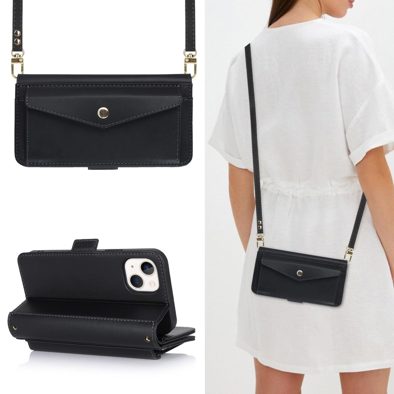 Eastwave for iPhone 15 ケース ショルダー クロスボディアイフォン 15 留め具 肩がけ 首掛け 斜め掛け カードケース for iPhone15 手帳型 携帯 ケース case 財布型 カード収納 小銭入れ PUレザー 6色 ブラック