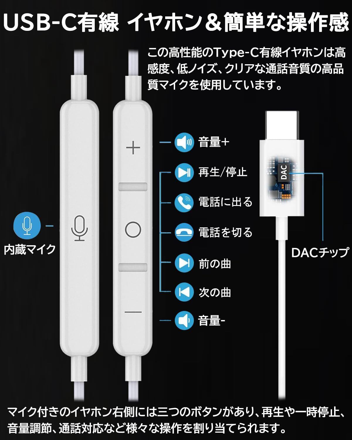 【没入感ある音質】Type C 有線 イヤホンはアップグレードチップを搭載し、最新改良の高品質スピーカーが搭載されており、複合鼓膜ダイナミックドライバーを備えており、イヤホンは内蔵の前後の振動膜アップグレードし、そのため、デジタル入力信号やハイレゾ音源に対応しており、高い解像度で音源を鮮明に再生することができます。HiFi高音質に対応し、音質劣化・遅延などを効果良く軽減し、純音信号がそのまま高速に伝送し、音質が非常に高精度でロスレスであるため、高音から重低音まで歪みのなく迫力な音質を伝達します。まるでコンサート会場のような雰囲気です。 また、このイヤホンは外部のノイズを効果的に遮断することができます。そのため、電車やエレベーターなどの公共の場所でも、音漏れを気にする必要がありません。音楽をよりクリアに聴くことができます。全ての音楽ファンにおすすめの製品です。