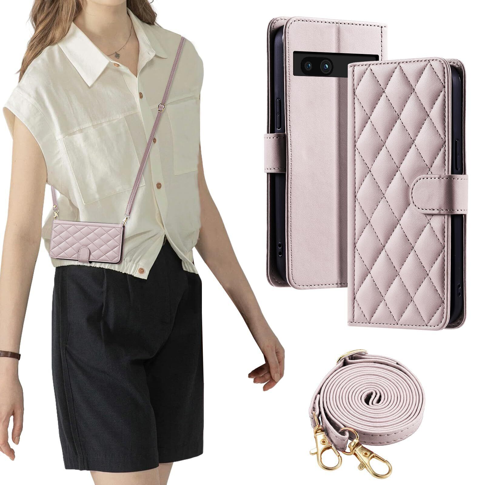 laddutoi FOR pixel 7a ケース ピクセル7a ケース 手帳型 おしゃれ ストラップ付き スタンド機能 カード収納 軽量 薄型 耐衝撃 高級PUレザー 滑り防止 財布型 内蔵マグネット 開閉式 チェック柄 上質 耐摩擦 マグネット式 肩掛け 斜め掛けーピンク