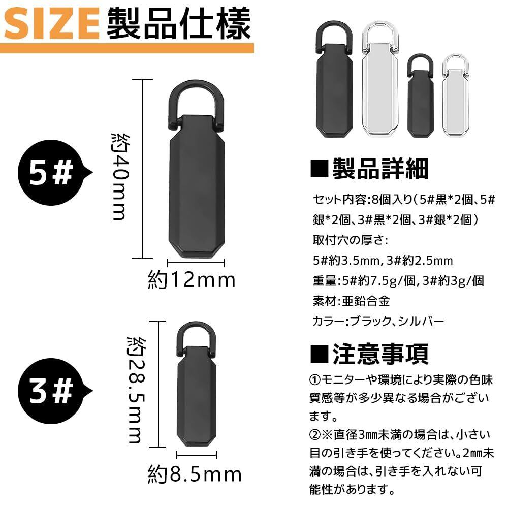 【サイズ&内容量】5#サイズ(約40㎜*12㎜)4個+3#サイズ(約28.5㎜*8.5㎜)4個。カラー:ブラック、シルバー、ゴールド選択可能。※ジッパーヘッドの穴が直径3mm未満の場合は、小さい目の引手を使ってください。2㎜未満の場合は、引手を入れない可能性があります。ご購入前にご確認してください。