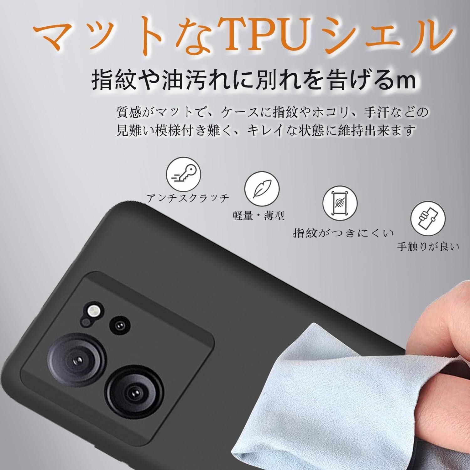【耐衝撃&防指紋&防汚】側面は衝撃吸収のTPU素材を採用し、効果的に衝撃を吸収し、あらゆる面でスマホを保護します。柔軟性のある衝撃吸収 Xiaomi 13T/13T Pro ケースで保護力を強化。どんな角度でもスマホを落とす心配はありません。 一方、ソフトタイプは柔らかく、滑らかな手触りです。触り心地がよく、今までにない滑らかなタッチを実現します。長時間スマホを触っていても、疲れません。表面には耐油コーティングが施されているので、クリアタイプに比べて水滴や指の脂、化粧の跡が目立たず、埃や汚れに強いです。 スマートフォンケースに水滴や油汚れが付着しても、やさしく拭き取ることができます