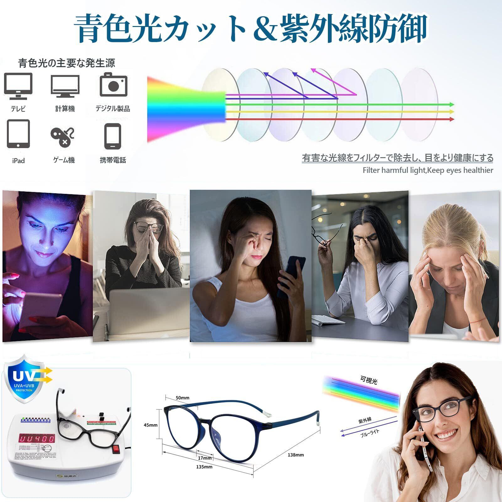 ブルーライトカット- パソコンやテレビ、携帯電話から出る有害なブルーライトをカットするメガネです。 高品質のブルーライト対策コーティングを採用し、レンズはクリアで、他の質の悪いブルーライト対策メガネのように黄色くならず、読書体験に影響を与えません。