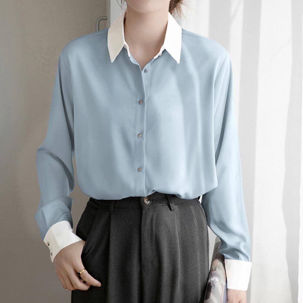 大人の抜け感が生まれているレディース長袖シャツです。バイカラーの配色がアクセントになり、全体的に単調さを解消しつつ、コーデ次第でトレンド感が一段とアップしてくれます。フロントや袖口に付けた釦がシルバーで目を惹いて、きれいめで華やかなブラウスです。ご注意:釦は菱形に近似した形で、釦の狭い方をボタンホールに合わせて掛けたり解けたりしやすくなりますので、お気になる方は予めご了承ください。バイカラーのデザインなので、浸け置き洗いや濡れたままの放置しないで、色落ちや色移りやすくなるので、洗濯後、必ず完全に絞ったり洗濯機で脱水したりしてからすぐに形を整えて日陰で干してください。