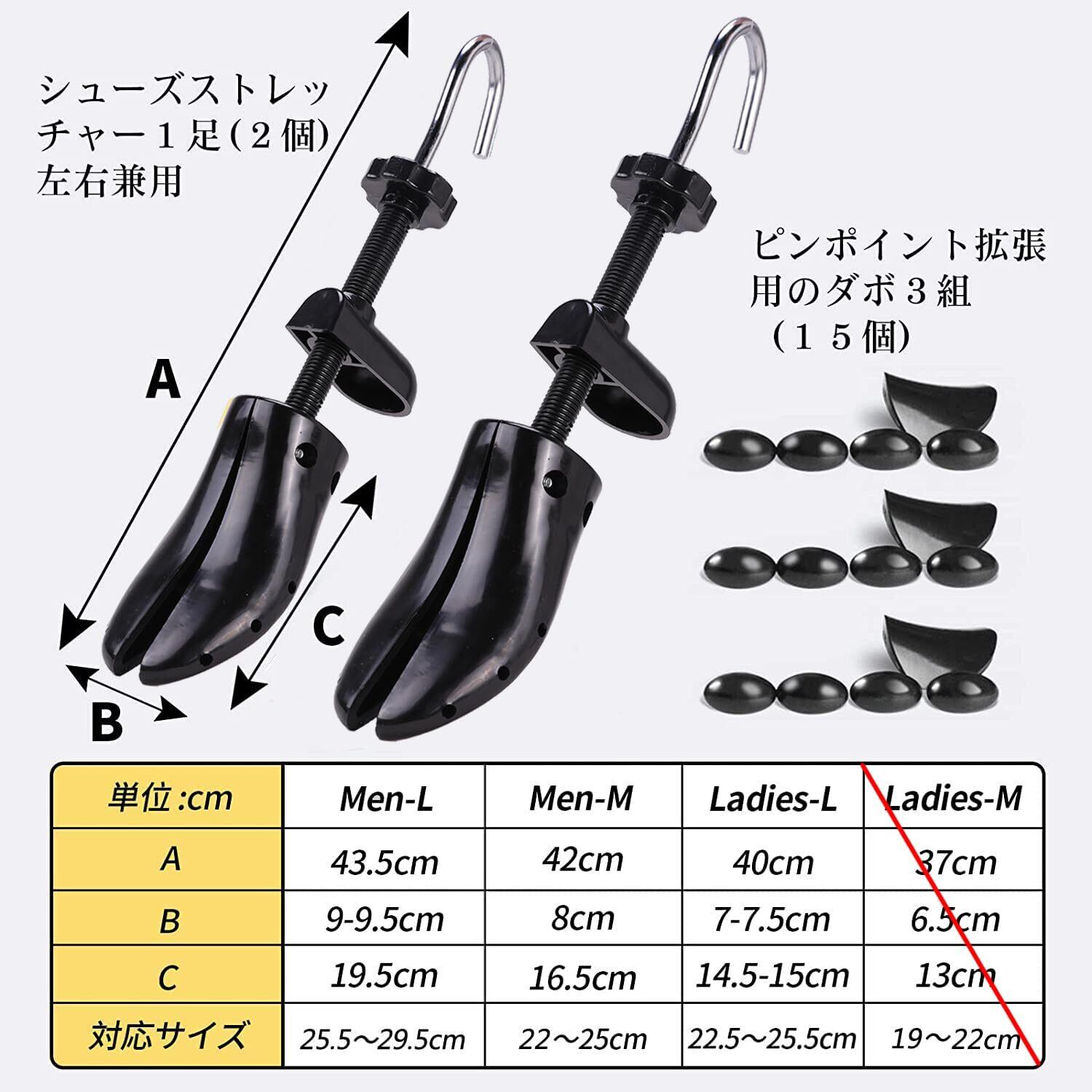 【ピンポイント伸ばし】拡張用のダボを差し込むと、特に伸ばしたい部分を伸ばすこともできます 。拡張用ダボが15個付属しております。ダボを使って、靴のピンポイントで広がり、足のまめや腱膜瘤の症状からの痛みを和らげます。