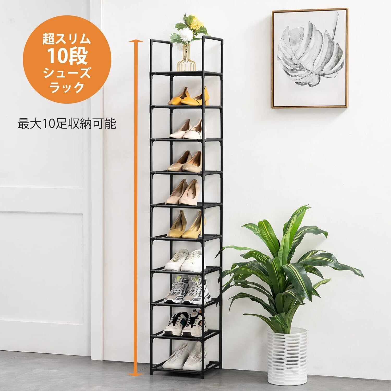 【スリム・省スペース】この縦長なシューズラックは専門に狭い場所に対応したの設計です。「サイズ:30x30x175cm」玄関、寝室、バスルーム、デパートの僅かな隙間などの場所に置くことができ、部屋をすっきり見せます。10段ラックには大人靴10足、各段に1足靴置きことができ、靴収納の需要を満たすと同時によりスペースを節約できます。一人暮らしでも家族でも、あなたに最適な選択です。
