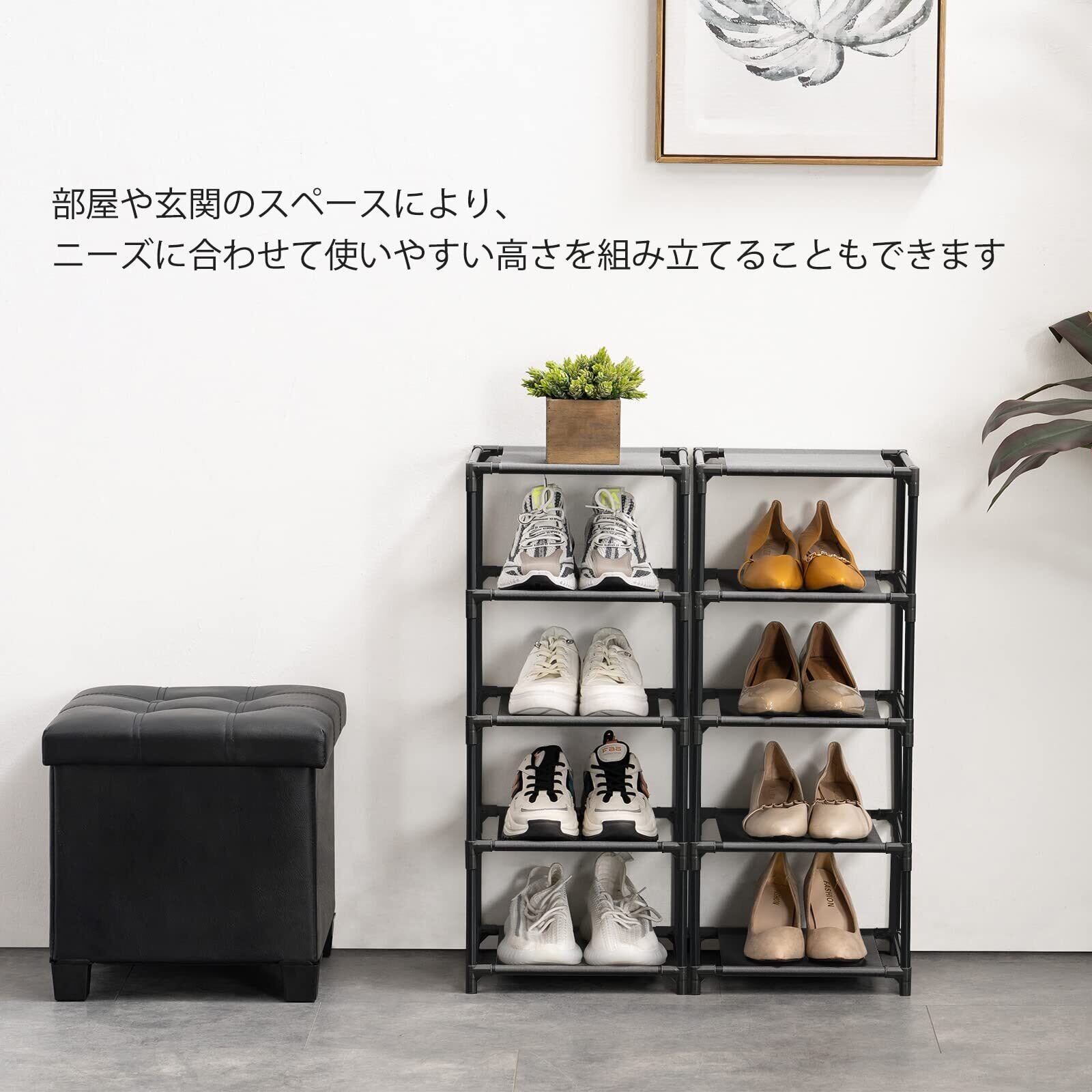 【棚数を自由にアレンジ】お好みのように棚の数を自由に調整し、2つの靴収納ラックに分けて異なる部屋に配置するできます。一つの棚は取り外せて、ブーツなども収納可能です。お勧め:棚の数が多い場合、下から上まで重い靴を置いたら安定性がよりよいです。