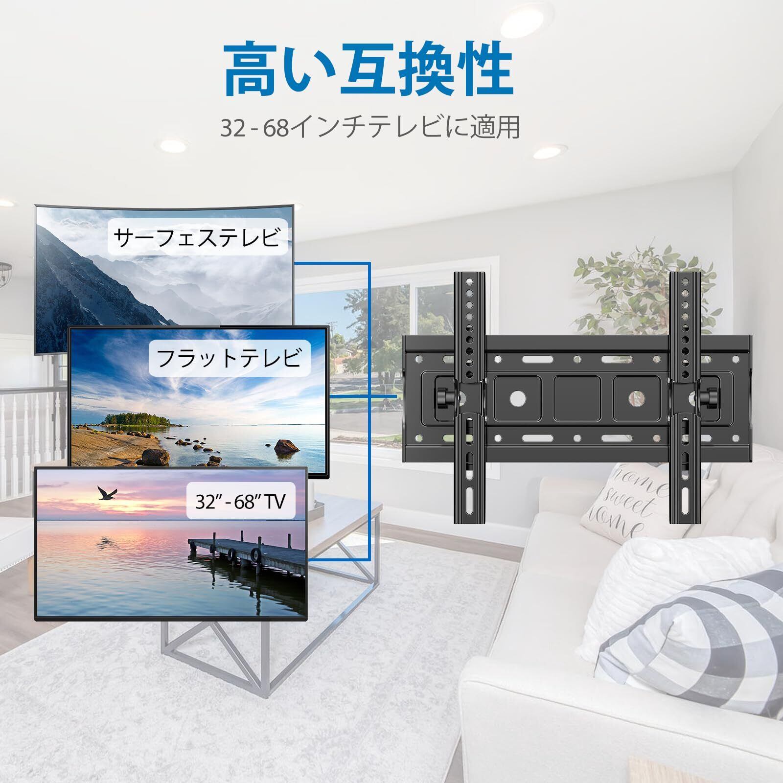 【共通機能-壁掛け tv 金具】こちらの壁掛けテレビ金具は32型~68型、重量60㎏以内のテレビ・モニターに設置可能です。対応の最大VESA規格は400x400㎜で、100x100/100x200/200x100/200x200/300x200/300x300/400x200/400x300/400x400mmなどに対応しています。