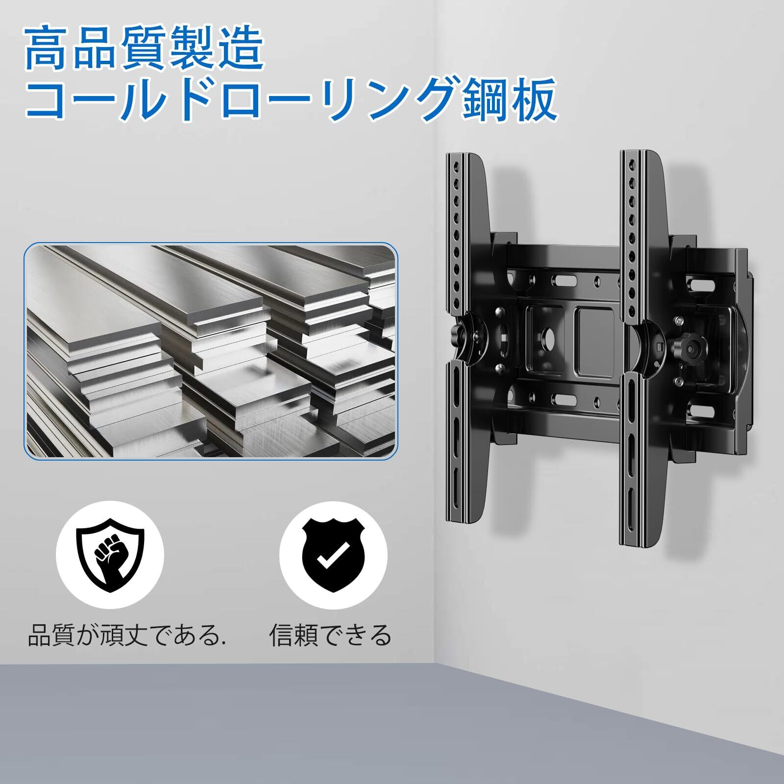 【高い汎用性で幅広いテレビに対応-VESA対応規格】テレビ/モニター背後のネジ穴間の距離は縦幅100x100mm~400x400mm以内かご確認ください。幅広いテレビに対応壁側ベースプレート、テレビ側ブラケットに幅広くネジ穴が開いているので対応範囲が広く様々な壁面状況・テレビサイズに対応します。