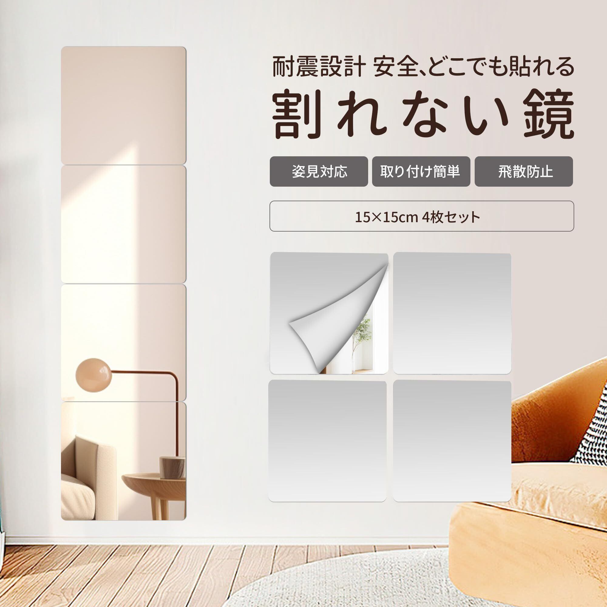 Hohoemi 割れない鏡 15×15cm 4枚セット 姿見鏡 壁掛け全身鏡 強力粘着テープ 防傷保護フィルム 寝室・浴室・リビングなど多用途対応 どこでも貼れる