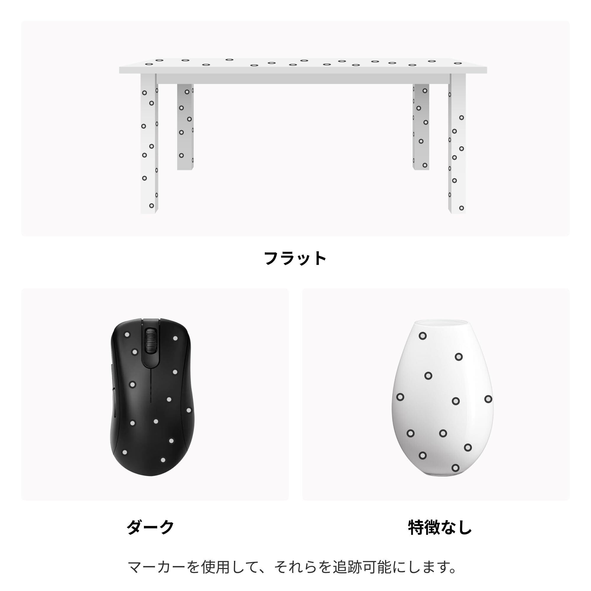 【おすすめの貼り方】板のような平らな面や、ボールのような特徴重複、対称的な物体をスキャンするには、スキャンマーカーを使って、マーカーによって形成されたユニークなパターンを識別することによって、点群データの各フレームの 相対位置を決定します。MINI: 1フレームに5枚以上、2~4cmの間隔でランダムに貼り付けます。オブジェクトと150㎜の距離で、1フレームは約120x65㎜です。/ POP2: 1フレームに5枚以上、2~4cmの間隔でランダムに貼り付けます。オブジェクトと275㎜の距離で、1フレームは約120x115㎜です。/ RANGE: 1フレームに8~15枚、6~10cmの間隔でランダムに貼り付けます。オブジェクトと600㎜の距離で、1フレームは約360x650㎜です。