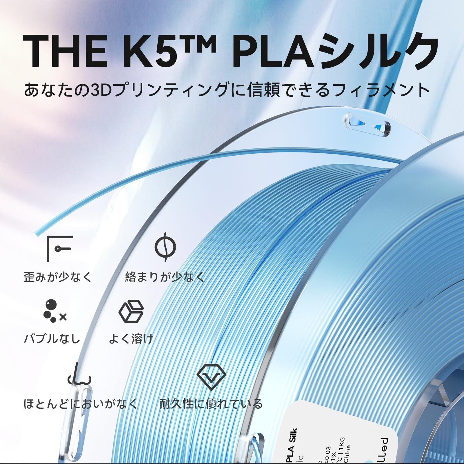 シルク・ラスター: PLA K5Silkは特別な反射メカニズムを持っており、素材自体にシルクの光沢を持たせ、層パターンが明らかに最適化されています。 本物のシルクのような光沢のある仕上がりで、余分な研磨は必要ありません、プリントの両面が異なる色で表示されるように、ちょうどmagic.Itのように、家庭、オフィスなどの装飾として使用することができ、良好な表面効果を持つモデルをプリントアウトするために非常に少ない後処理を必要とするだけです