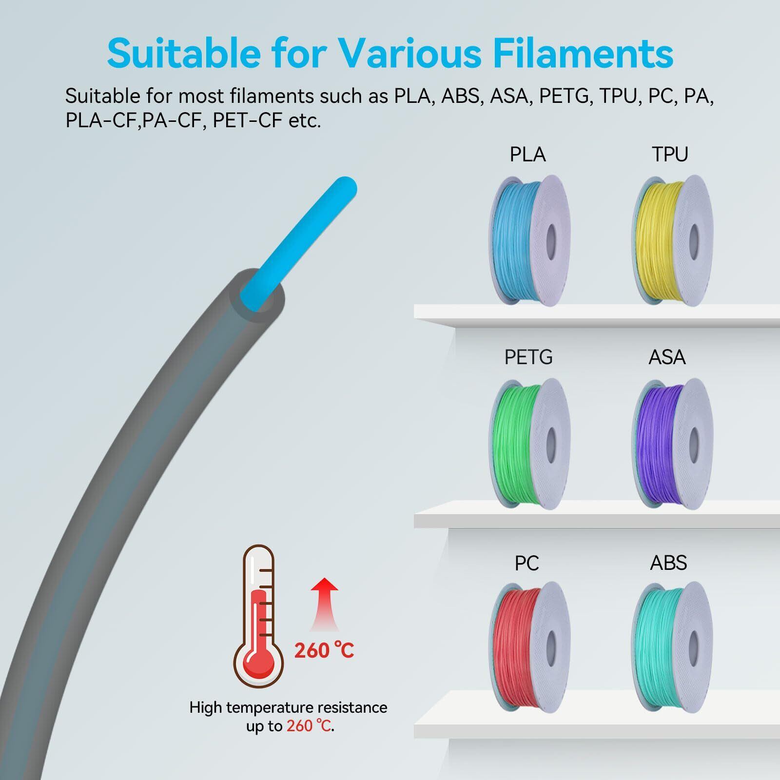 【高温耐性】PTFEチューブは広い温度範囲を持ち、260℃までの温度に耐えます。PLA、PLA+、ABS、PETG、TPU、その他多くの3Dプリントフィラメントの印刷に適しています。