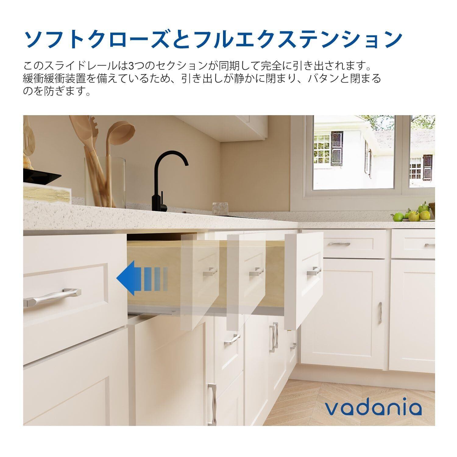 【ソフトクローズ&フルエクステンション】同期された 3 セクションスライドを備えたこの引き出しスライドは、完全に伸びて簡単にアクセスできます。内蔵のバッファーダンピングデバイスにより、静かに静かに閉まり、引き出しがバタンと閉まるのを防ぎます。