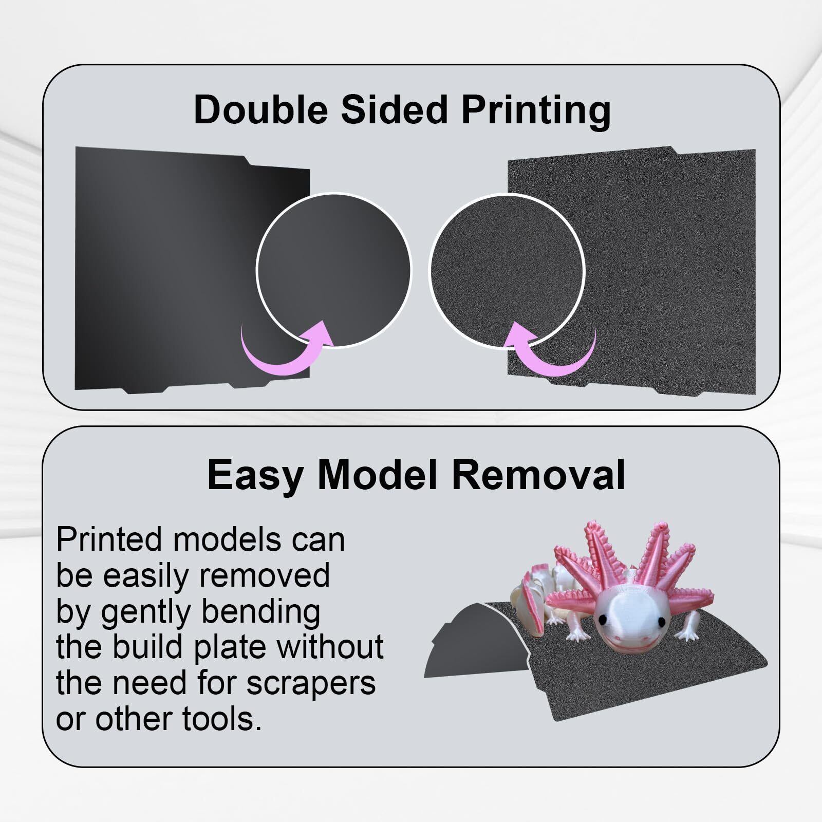 【両面使用】スムーズPEI+テクスチャーPEI、一方は滑らかな印刷面であり、もう一方はテクスチャー面である。プレート全体はプリンターの色に完全に適した黒のデザインです。両面使用利用率の向上。