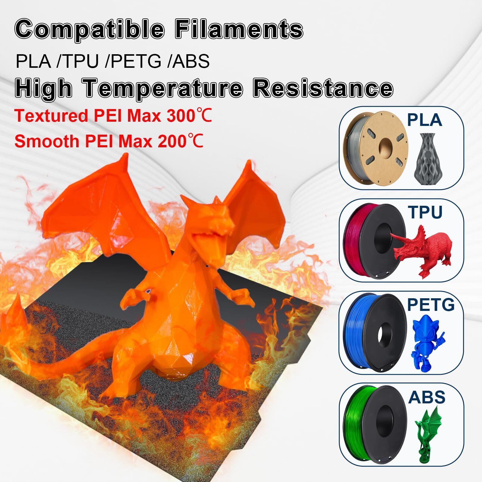 【互換性】PLA/PETG/ABS/TPU/Nylon/PC/PA/ASA/PVAフィラメントをサポートしています。テクスチャーPEI面の最高温度が300℃、スムーズPEI板の最高温度が200℃である。Bambu Lab A1 miniに適します。