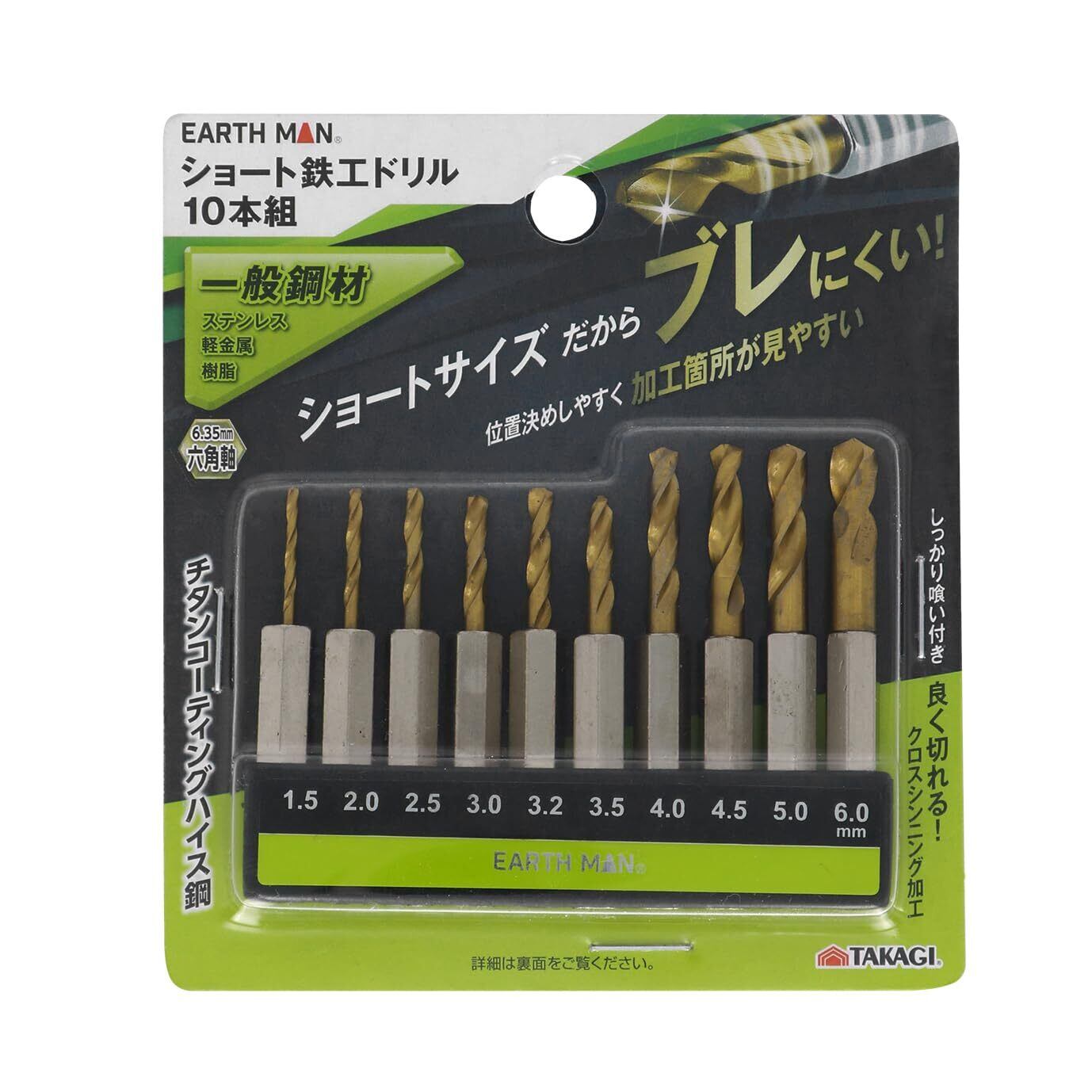 高儀(Takagi) EARTH MAN ショート 鉄工ドリル 10本組 6.35mm 六角軸 ショートサイズだからブレにくい 位置決めしやすい 加工箇所が見やすい しっかり喰い付くクロスシンニング加工 チタンコーティングハイス鋼 高儀 たかぎ