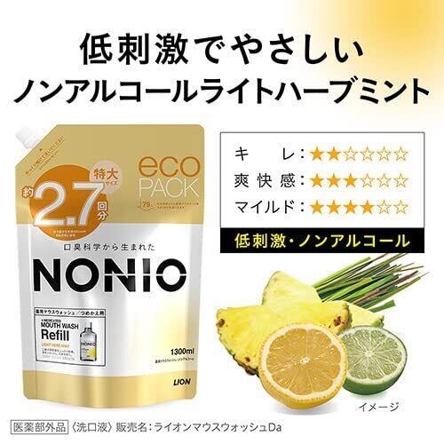 【詰め替え大容量】NONIO(ノニオ) マウスウォッシュ ライトハーブミント 低刺激ノンアルコールタイプ [医薬部外品] 1300ml 洗口液 パウチ 口臭原因菌を殺菌
