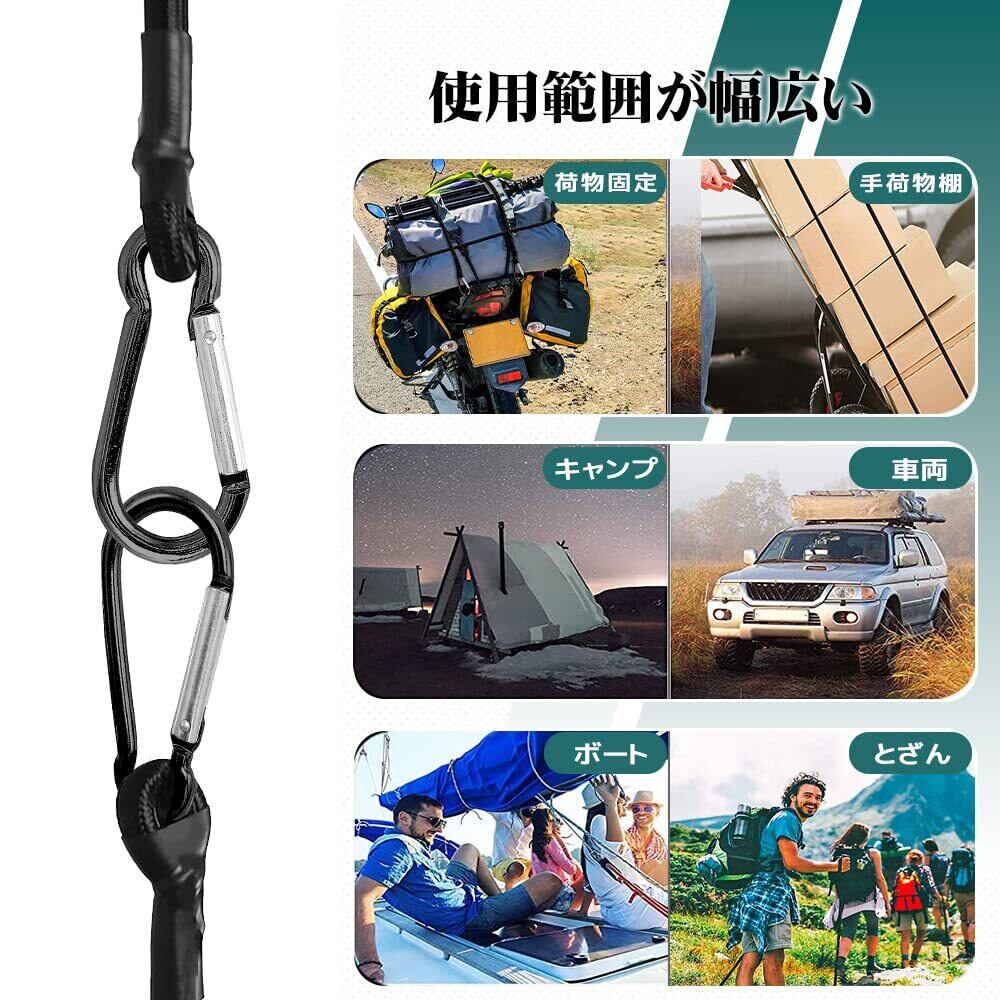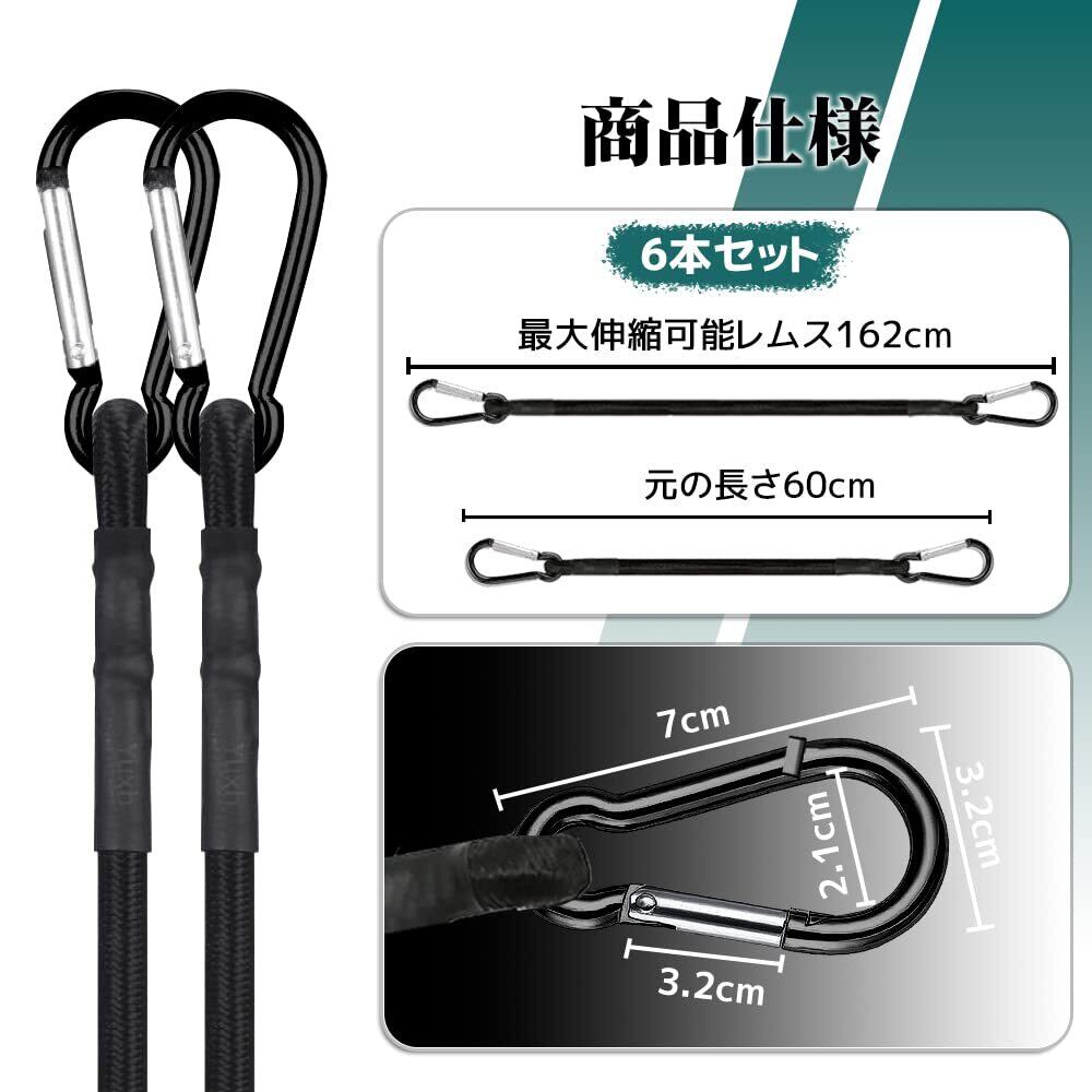 【製品仕様】セット内容:ゴムバンド フック付き カラビナ*6。ロープ材質:ポリエステル(表面)、ゴム(内部)、カラー:ブラック、サイズ:幅約7mm / 長さ60cm、カラビナ材質:アルミニウム合金、重量:約50g/個、耐荷重:30KG。