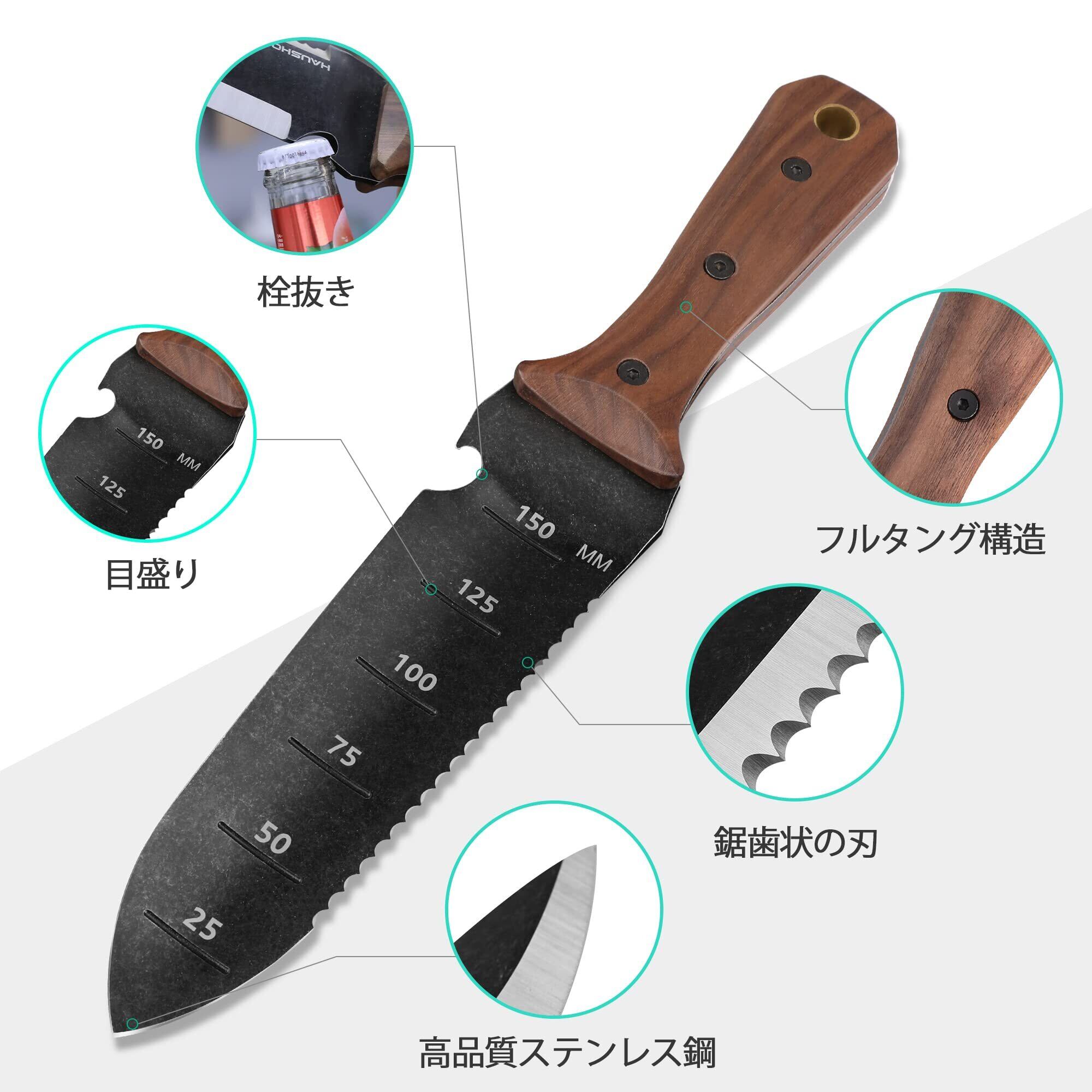 HAUSHOF 多機能園芸ツール ガーデンナイフ 山菜堀 山刀 園芸ツール スコップ ステンレス鋼 ストーンウォッシュ処理 目盛り付き ブレード 丸型 根切り・草取り・山菜採りに 収納ケース付き