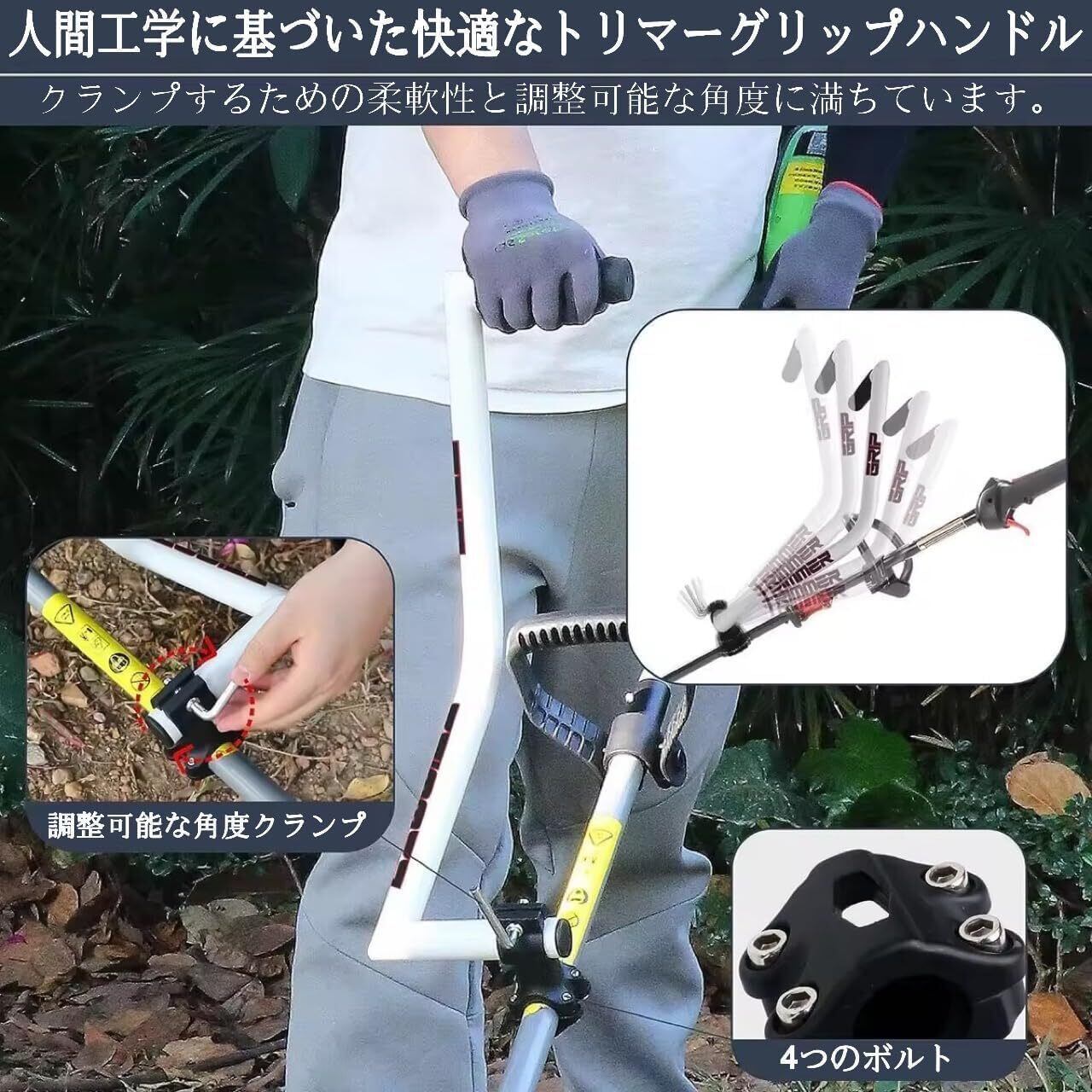 便利なトリミングハンドル:当社のトリミングハンドルを使用すると、オペレーターは草を刈る際により直立して立つことができ、長時間のトリミングセッション中の腰への負担を軽減します。人間工学に基づいたデザインにより、快適なグリップを実現し、疲労を軽減します。