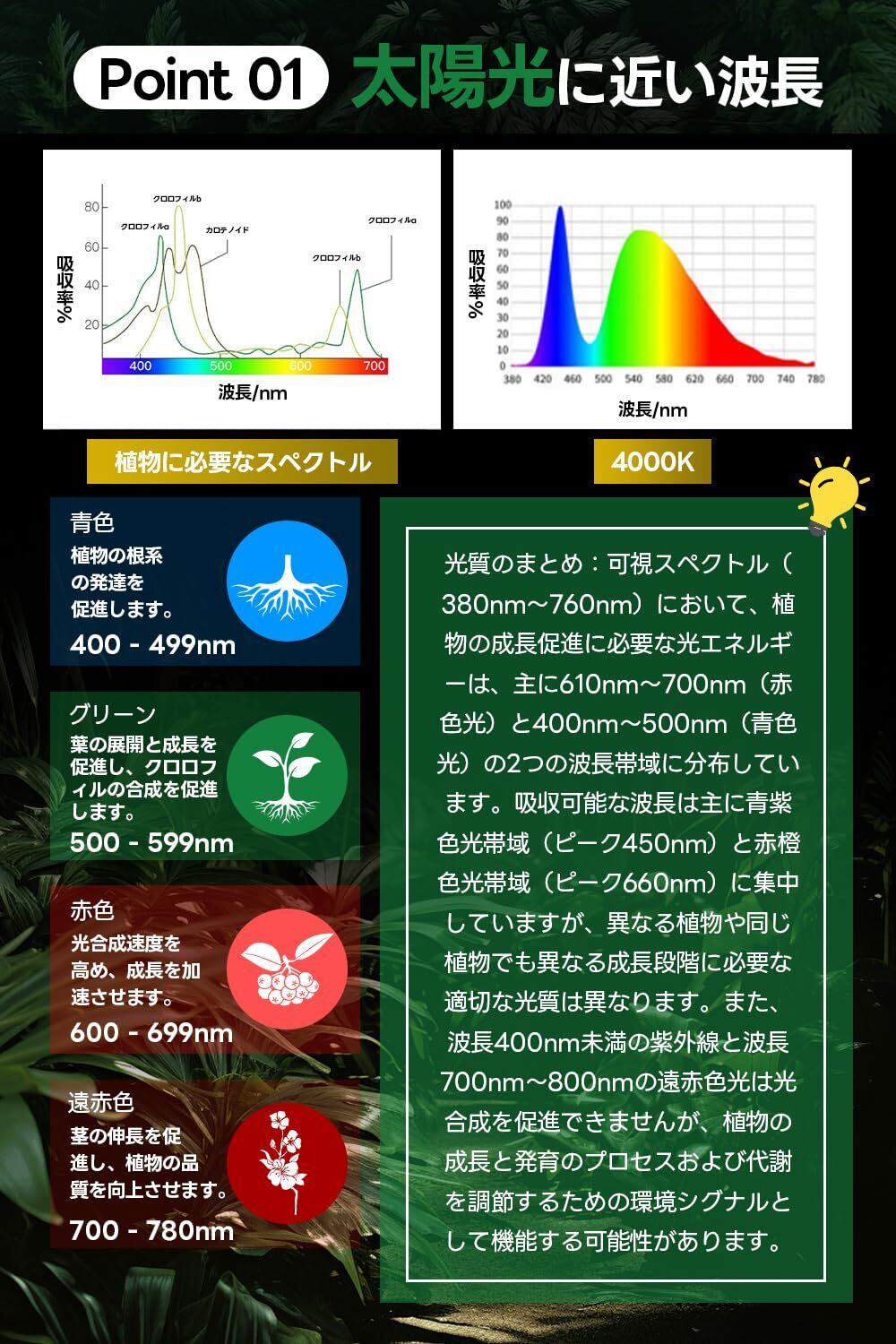 【CRI≥97高演色性】 植物育成ライトの演色性評価数(CRI≥97)で、演色性は太陽光とほぼ同じです。植物育成ライトの照射により、植物の実際の成長は太陽光下での成長状態に近づきます。