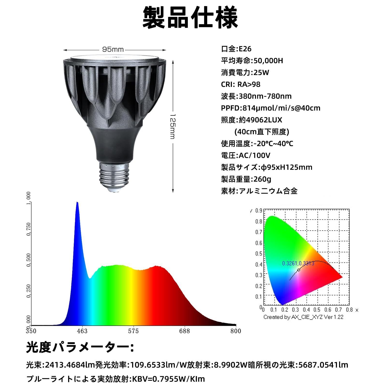 25W 植物育成ライトLED E26口金 フルスペクトル 黒色系 5800K 高PPFD 高力率 高演色性 植物用 LEDライト 長寿命フラットウェーブ搭載(広角60°レンズ付)