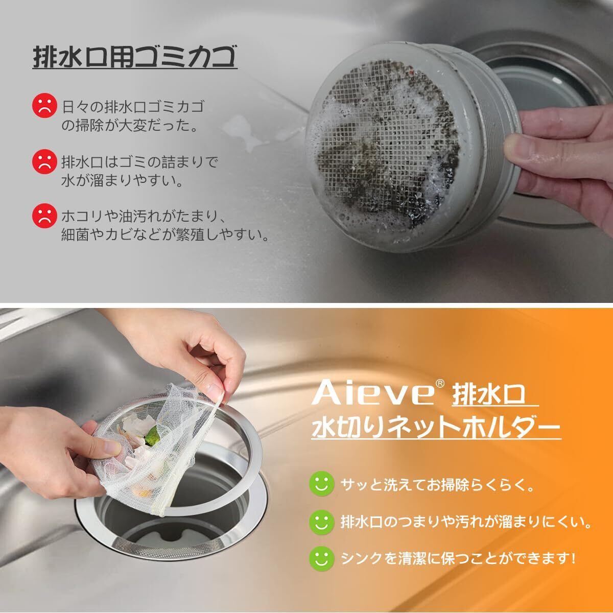 【掃除らくらく】キッチン排水溝ゴミ受けは、バスケットいらずに水切ネットを固定するだけで、日々の排水溝のゴミ受けの掃除の手間が省け、汚れ取りのストレスが解消してくれます。