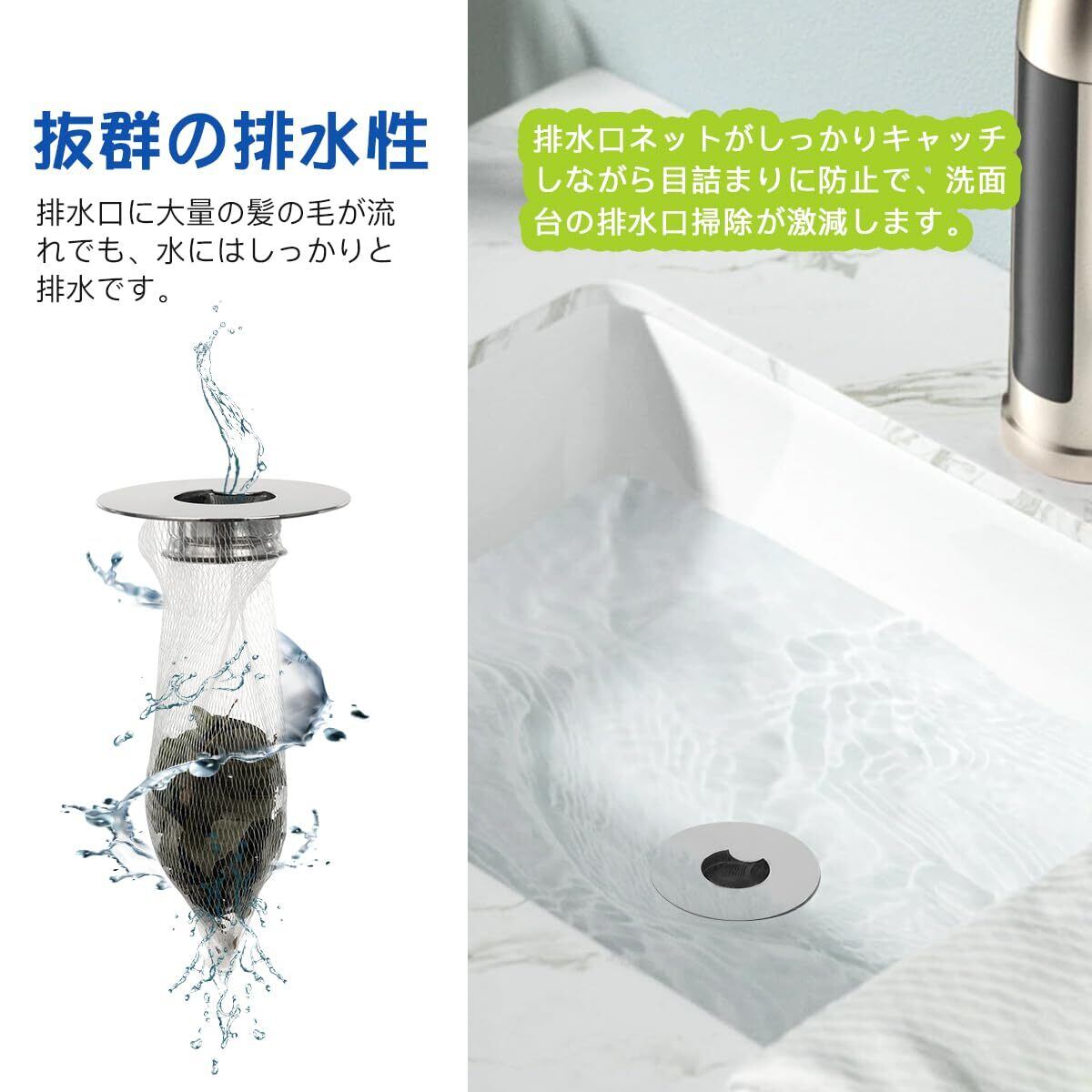 【掃除から解放】:髪の毛キャッチャーにネットを装着することで、洗面台の髪の毛や細かいゴミをしっかりキャッチします。お掃除の際はネットを取り替えるだけなので、掃除作業が減り、面倒だった排水口のお掃除が楽になりました!