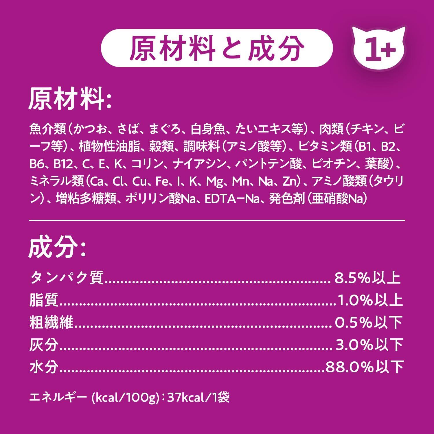 ●原材料:魚介類(かつお、さば、まぐろ、白身魚、たいエキス等)、肉類(チキン、ビーフ等)、植物性油脂、穀類、調味料(アミノ酸等)、ビタミン類(B1、B2、B6、B12、C、E、K、コリン、ナイアシン、パントテン酸、ビオチン、葉酸)、ミネラル類(Ca、Cl、Cu、Fe、I、K、Mg、Mn、Na、Zn)、アミノ酸類(タウリン)、増粘多糖類、ポリリン酸Na、EDTA-Na、発色剤(亜硝酸Na)、●成分:タンパク質:8.5%以上、脂質:1.0%以上、粗繊維:0.5%以下、灰分:3.0%以下、水分:88.0%以下、●代謝エネルギー:37kcal/1袋