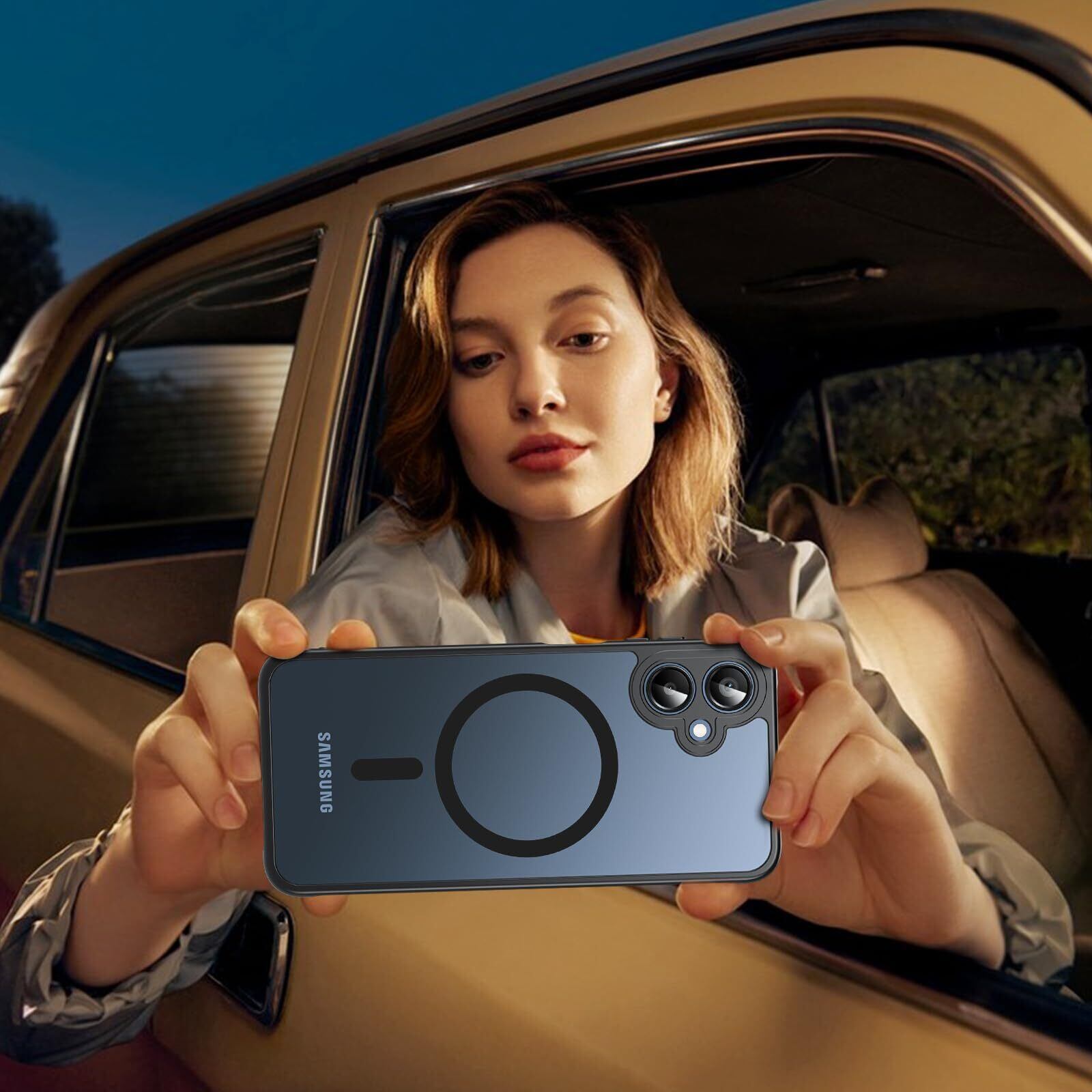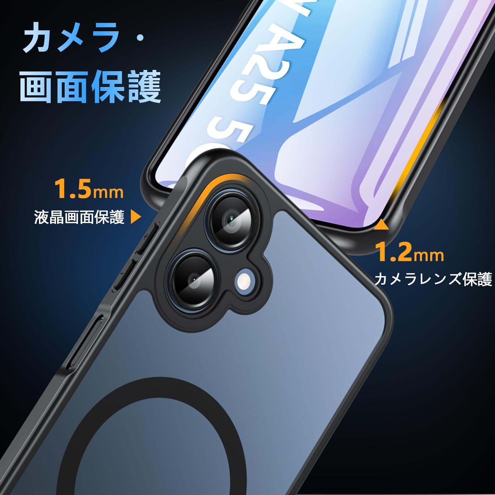 Hensinple Galaxy A25 5G ケース 【ガラスフィルム付き】 ギャラクシーa25 カバー 半透明 耐衝撃 黄ばみなし 滑り止め 指紋防止 マグネット搭載 マグセーフ対応 ストラップホール付き MagSafe対応 Samsung Galaxy A25 5G (SC-53F/SCG33) スマホケース 6.7インチ用 ブラック