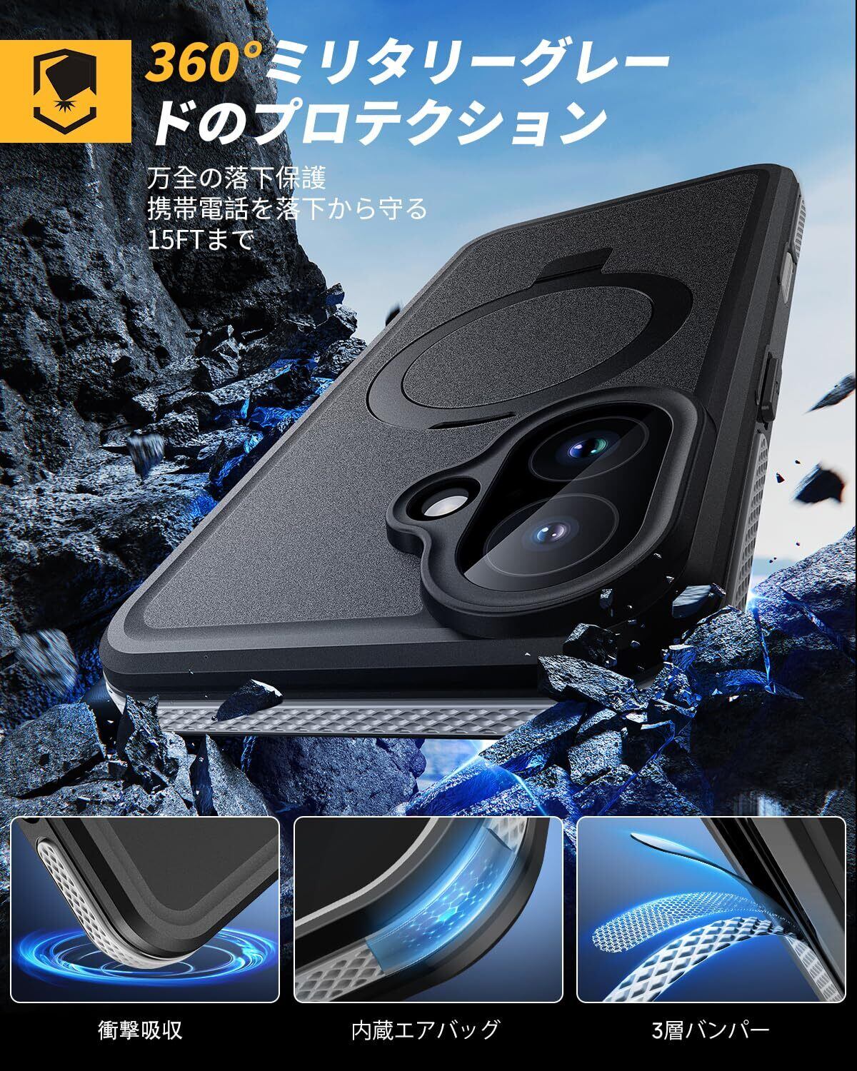 【強力な耐衝撃性・360°保護】耐衝撃試験「MIL-STD-810G」認定された耐衝撃性の高いポリカーボネート素材を採用し、あらゆる角度からの衝撃に耐えるマルチ耐衝撃構造で、大切なスマートフォンをしっかりと保護します!日常生活におけるあらゆるダメージを防ぎ、本体の細部まで安全に保護します! エッジはスクリーンやカメラレンズより1.5mm高いので、デスクトップでの摩擦を心配する必要がなく、スクリーンやレンズを効果的に保護します。