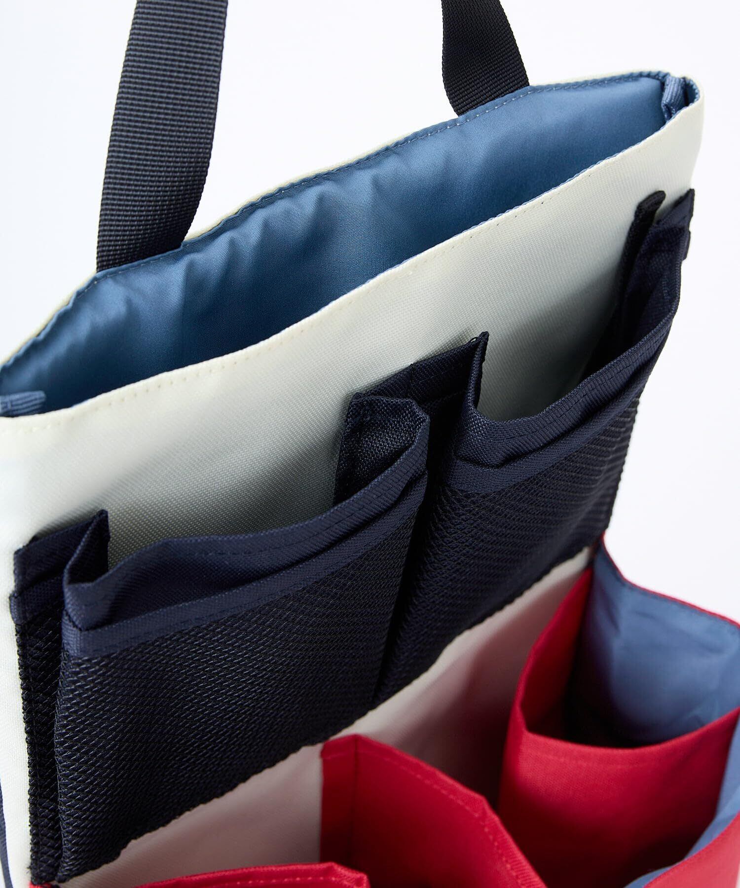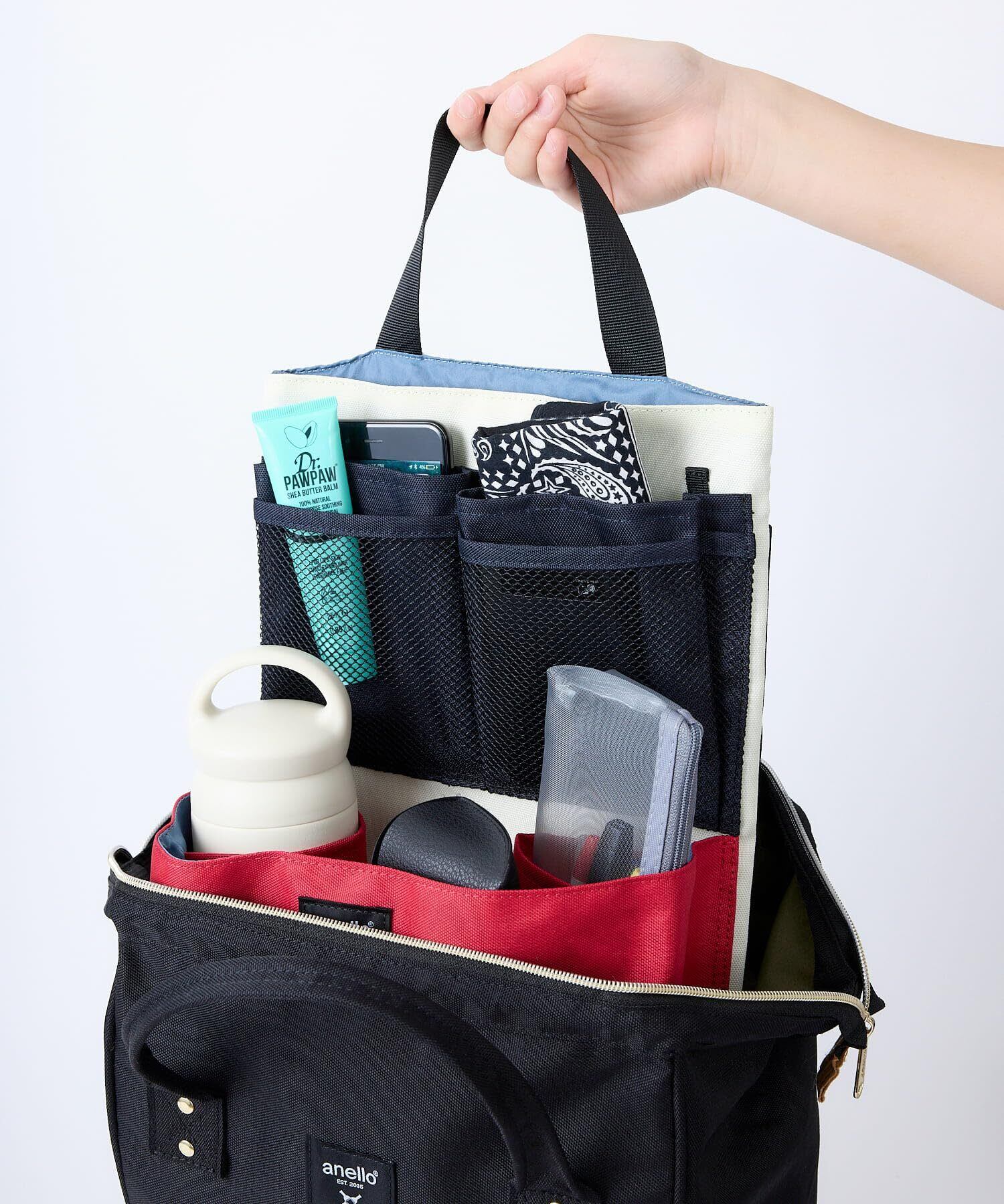 ペットボトルリサイクル生地のREPREVE?を使用したCROSS BOTTLEシリーズ。リュックやタテ型のトートバッグの中の荷物をきれいに整理整頓できるバッグインバッグ。ドリンクホルダーやキーフック、PC収納も装備していて便利◎