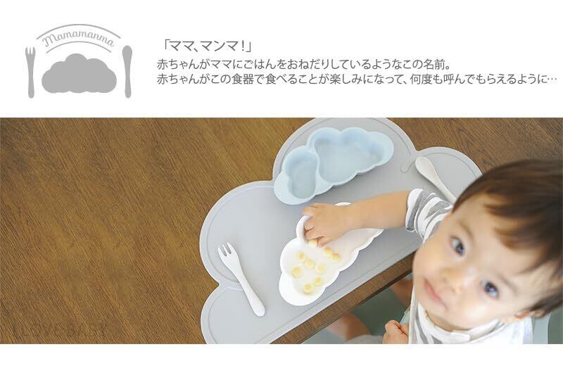 離乳食~キッズのおやつ皿まで長く使えるサイズで、もくもくした雲の形はごはんがすくいやすい設計です。