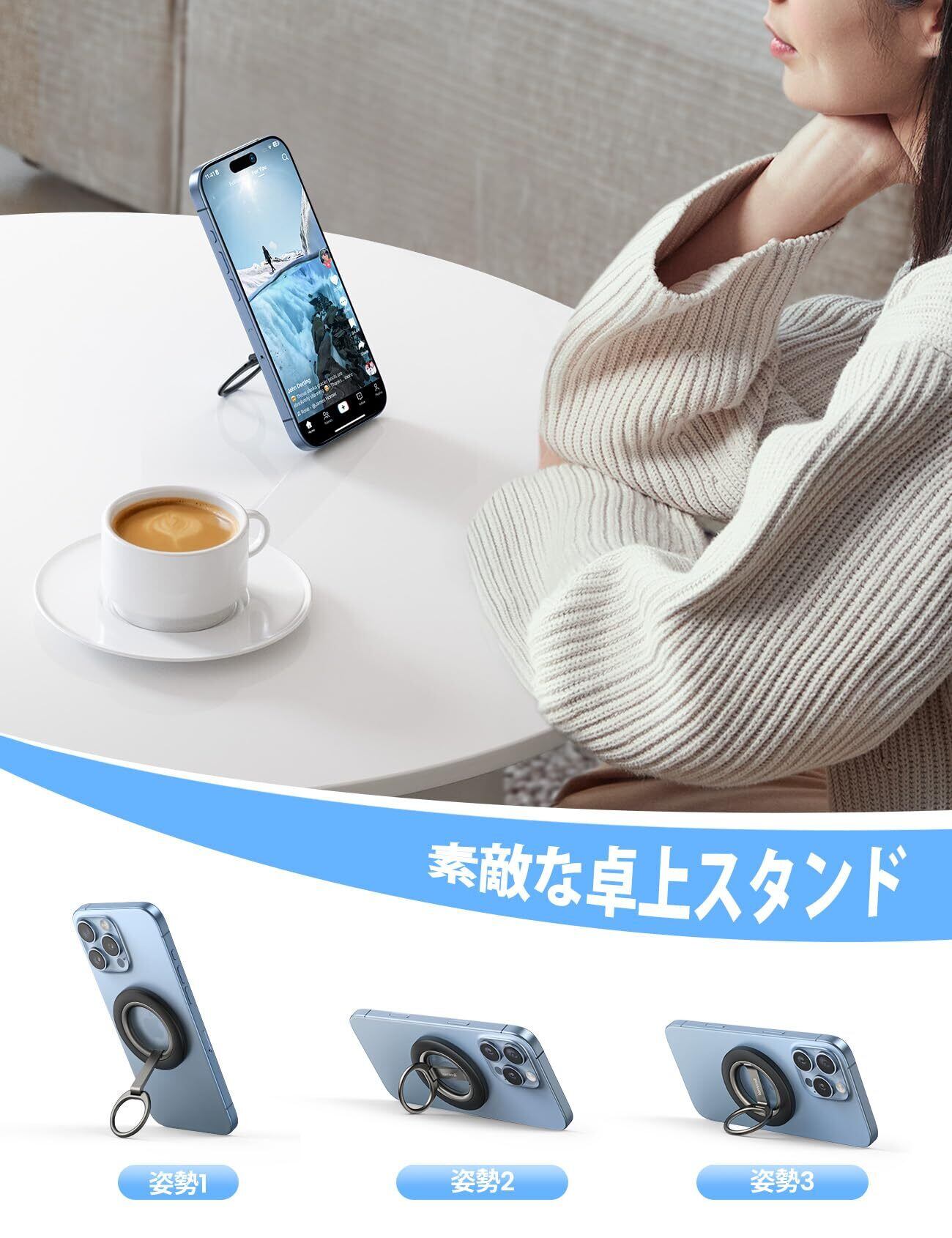 ️【機械感・360度回転可能】️Magsafe対応スマホリングは内部に機械構造が設置され、楽のカチカチ回転音が鳴ると同時にスムーズに360度回転機能を実現します。回転感抜群!Magsafeリングには内部が回転可能なので、スマホリングを外しなくてもスタンドを回転させ、お好みの角度を調整できます。角度は自由に調整できるので、動画視聴やビデオ通話が驚くほど快適になります。両手も解放し、スマホの操作や動画を見ることなどをより便利になります。