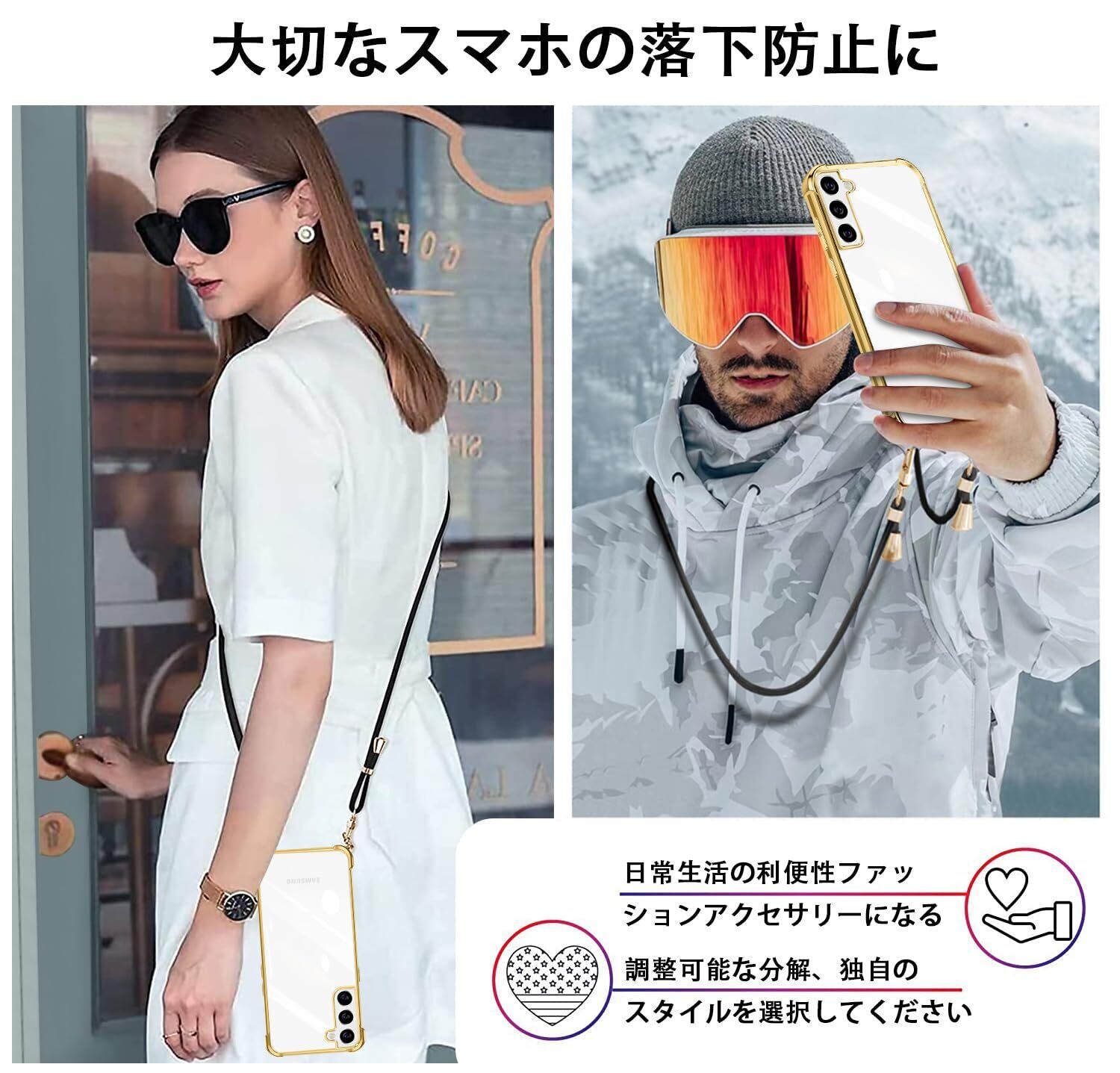 weiaoluo Samsung Galaxy S21 ケース クリア ショルダー 耐衝撃 galaxy SC-51B SCG09 マホケース ギャラクシーS21 カバー 薄型 galaxyS21 対応ケース TPU 軽量 肩がけ 首掛け 紐付きバンパー カバー ストラップ付き ストラップホール付き 透明 着脱可 調節 Qi充電 ワイヤレス充電 傷防止 (ゴールド)