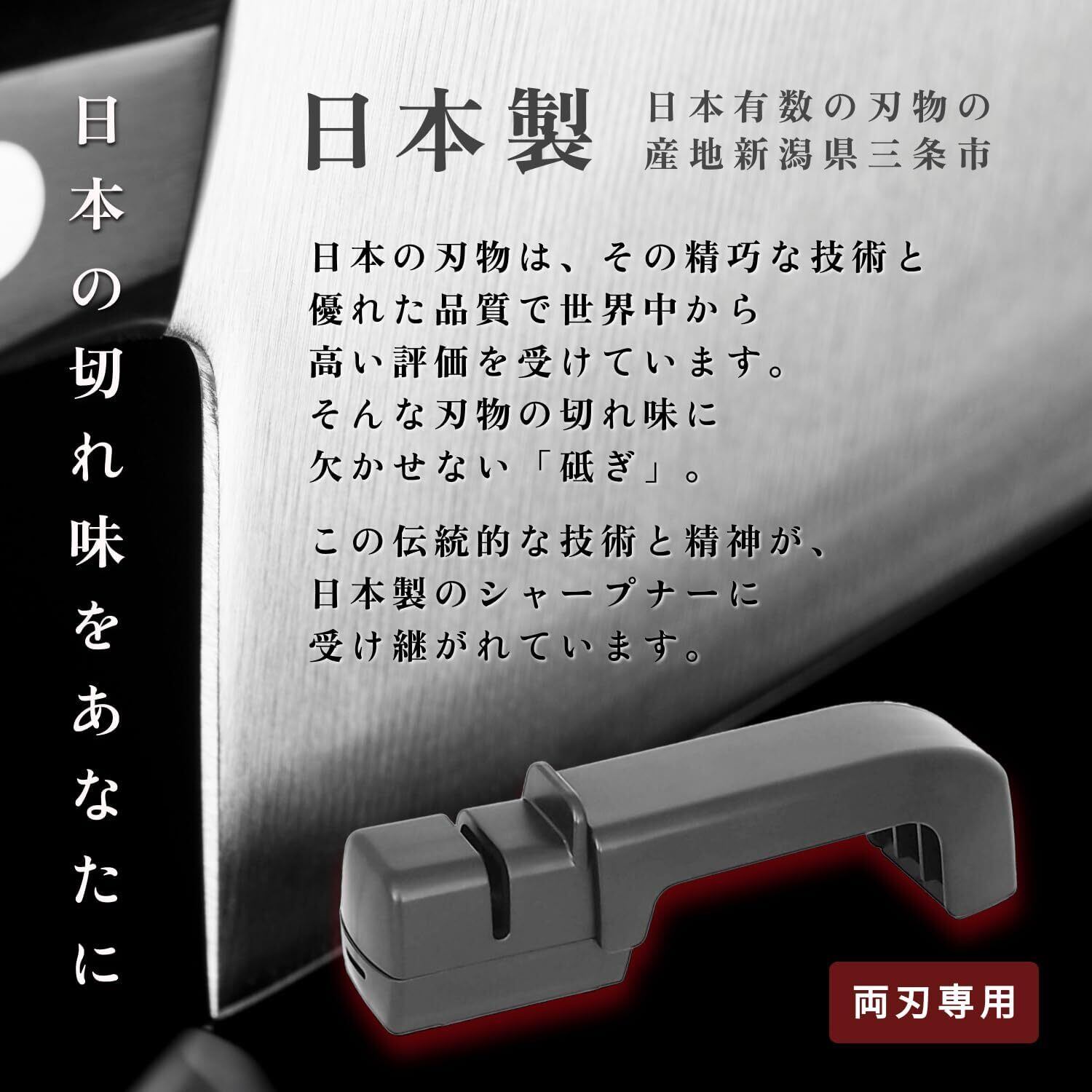 【日本製】日本製のシャープナーだから提供できる抜群の切れ味!「刃物にこだわりがある国」といえば、まず思い浮かぶのが日本です。日本の刃物は、その精巧な技術と優れた品質で世界中から高い評価を受けています。そんな刃物の切れ味に欠かせない「砥ぎ」。この日本の刃物の伝統的な技術と精神が、日本製のシャープナーにも受け継がれています。本品は日本有数の刃物の産地新潟県三条市でつくられています。