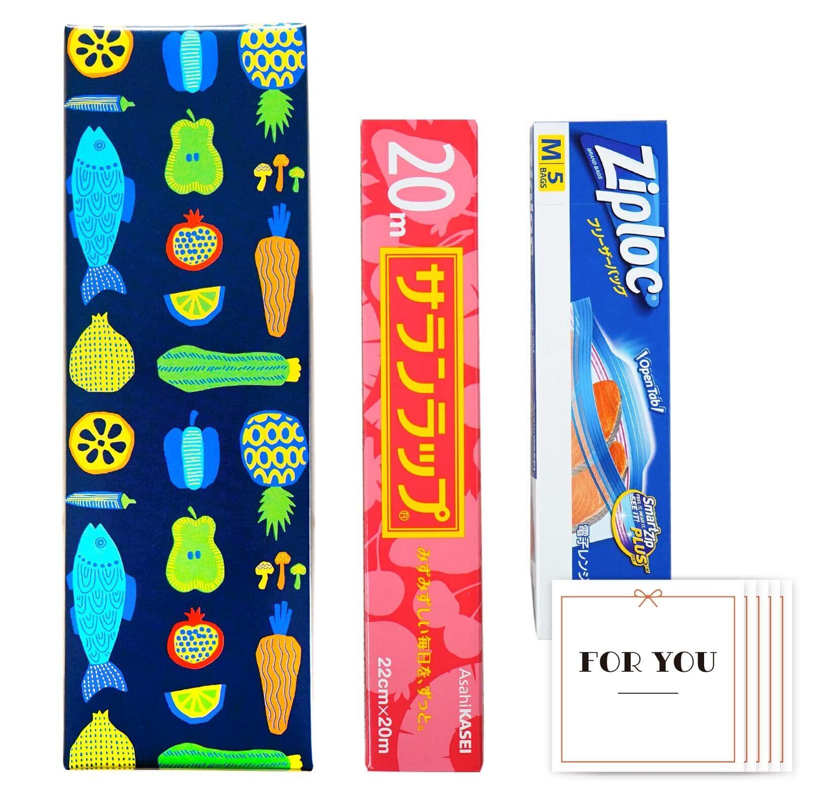 旭化成製品の「サランラップ 幅22cm×20m」と「ジップロックフリーザーバック Mサイズ5枚」が入ったギフトセットをしゃれなネイビーカラーの北欧風包装紙で包みました! もらった方はワクワク楽しい気分になれます もちろん購入するあなたもハッピー!