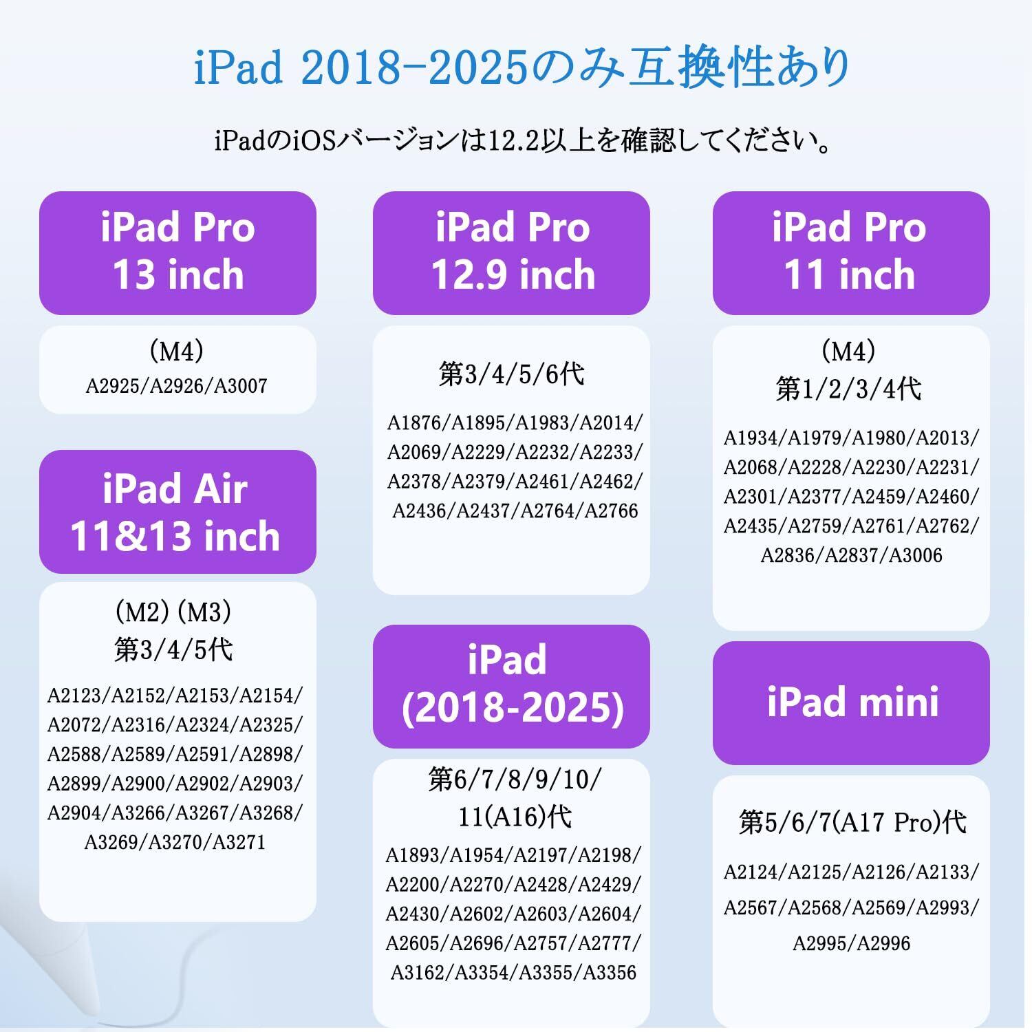 【2018-2025互換性ありiPad専用ペン】iPad Pro 11インチ(第1/2/3/4/世代) 、iPad Pro 12.9インチ(第3/4/5/6世代) 、iPad Pro 13(M4)、iPad Air11/13インチ (第3/4/5/M2/M3世代) 、iPad (第6/7/8/9/10/11(A16)世代)、iPad mini (第5/6/7世代)。
